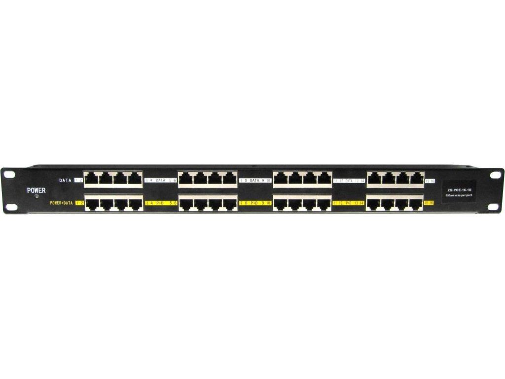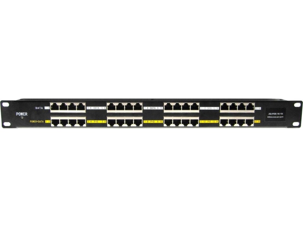 Stíněný panel integrující 16 pasivních POE injektorů vhodný pro napájení až šestnácti aktivních prvků v provedení do 19" racku.