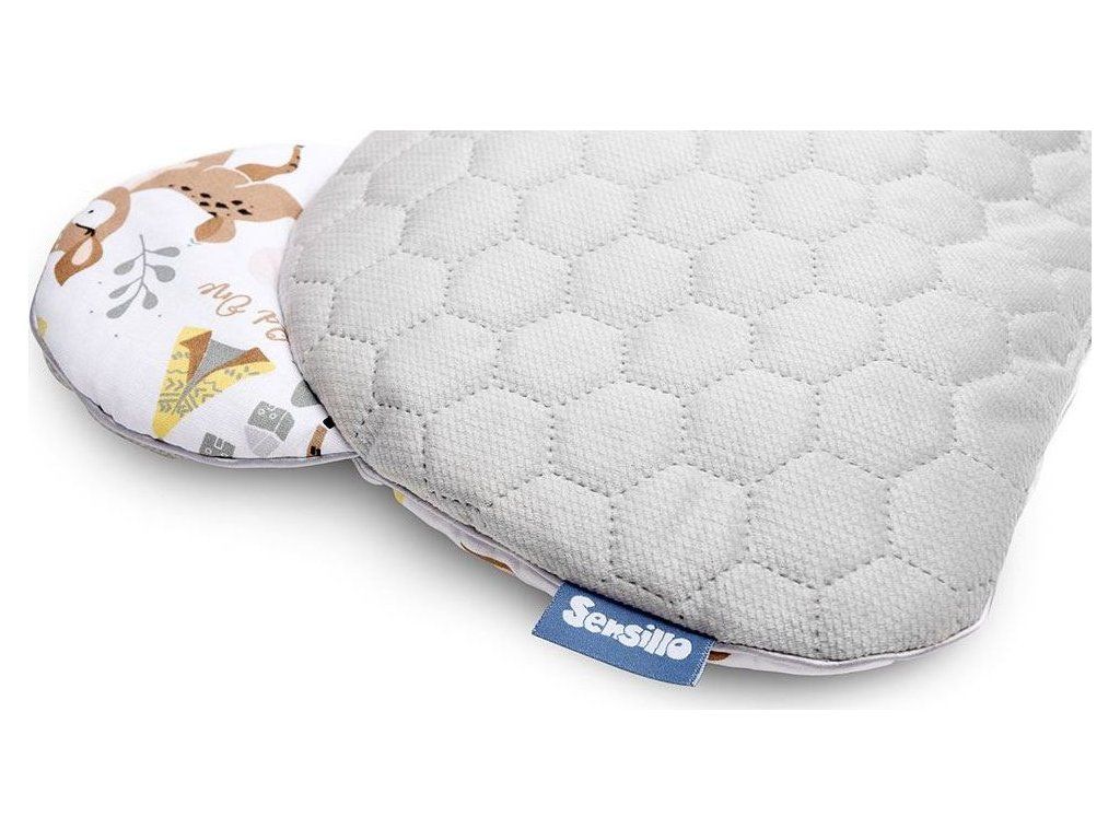 Polštář do kočárku Sensillo je perfektním měkkým polštářem k použití od prvních měsíců života dítěte. Můžete jej použít jak doma, tak na cestách. Hodí se jak do postýlky, tak do kočárku (můžete jej uvázat na vložku do kočárku). Polštář je oboustranný - na jedné straně má vrstvu 100% bavlny, na druhé straně měkký samet. Polštář má našité stuhy pro spojení s vložkou do kočárku. V případě potřeby je lze snadno odstranit. snadno se udržuje v čistotě Rozměry: 33 x 26 cm. Potah: 100% bavlna / 100% polyester