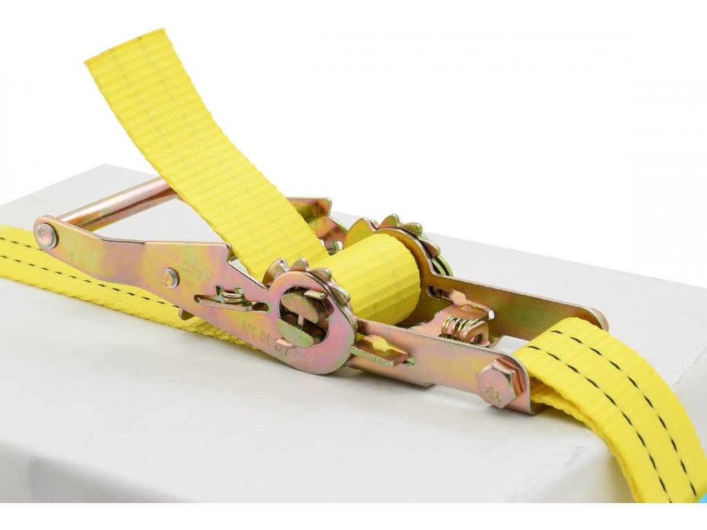 Upínací ráčnový popruh s kovovými háky, s homologací TÜV/GS, pro zajištění těžkého nákladu.