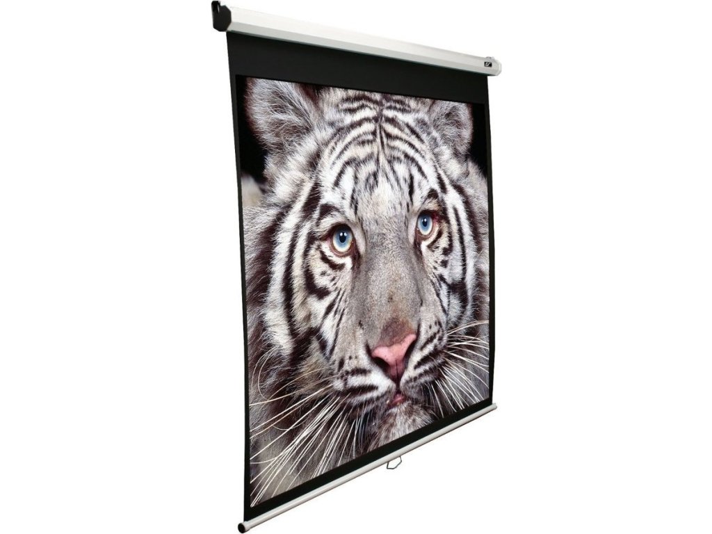 Elite Screens M150XWH2Mechanické roletové plátno s úhlopříčkou 150" a technologií MaxWhite, která používá bílou projekční plochu a speciální černé pozadí s omezením nežádoucího rozptylu světla. Kromě toho nabízí šířku zorného úhlu až 160°, je odolné a snadno se myje. Plátno je možné připevnit na strop nebo stěnu.