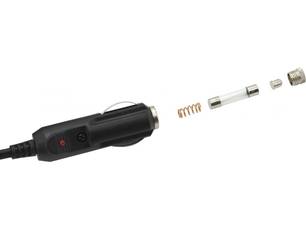 Zapojení do běžné zásuvky automobilového zapalovače 12V konektorem. Zásuvka je opatřená skleněnou pojistkou.