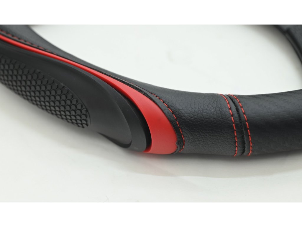 Zpracování na černém podkladu je dolpněné častmi se vzorem imitujícím karbon a prošíváním v červené barvě. Úchopová část je tvořena měkkou gumou v kombinaci černé a červené barvy.