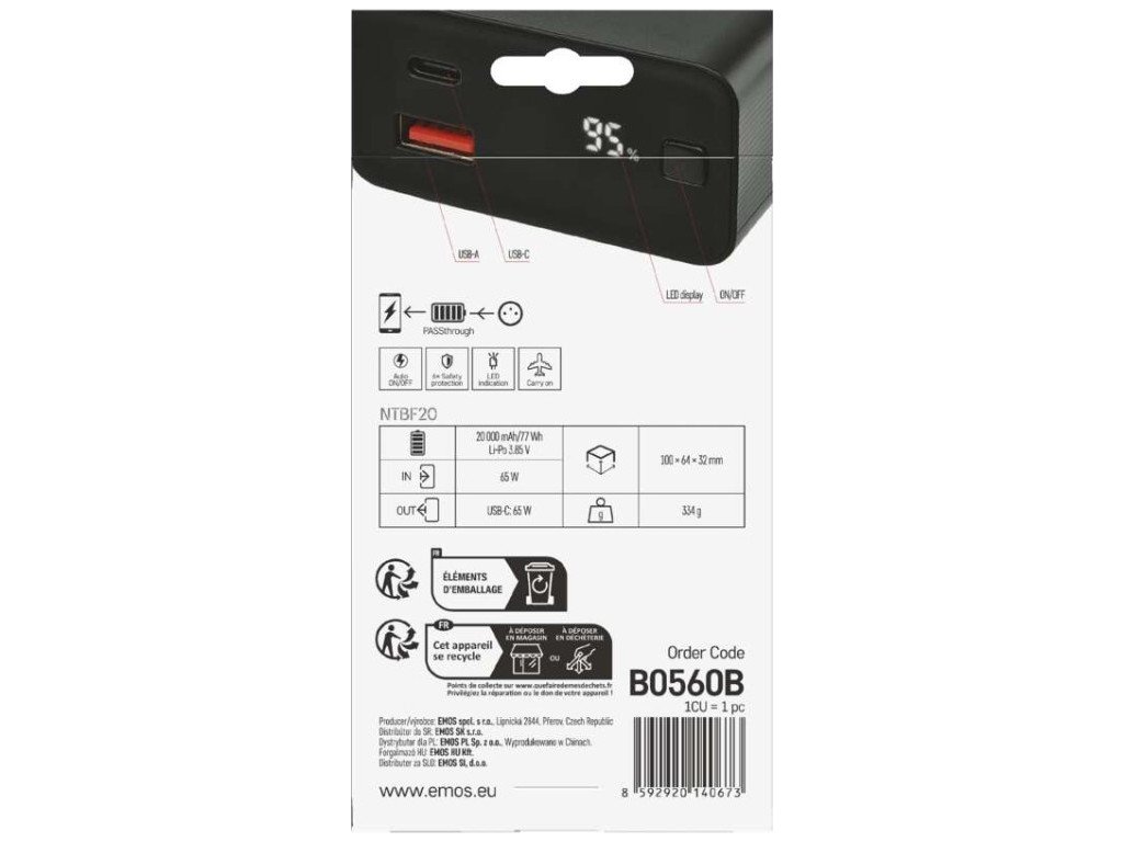 Powerbanka EMOS NTBF20, 20 000 mAh, 65 W PD, černá