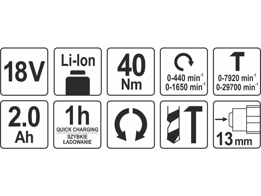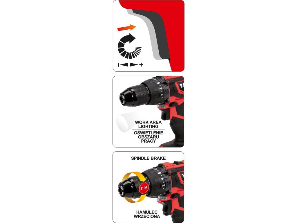 Příklepová AKU vrtačka YATO o síle 18V (max. otáček 1650 za minutu) s vysoce kvalitním pohonem.