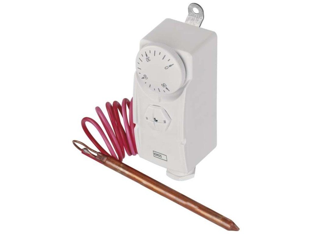 Příložný termostat s prodlouženým čidlem pro povrchovou montáž. Snímá teplotu vody v zásobnících teplé užitkové vody a nebo v topných systémech. Umožňuje regulaci teploty, hlídání teplotních omezení a funkci poklesu teploty.