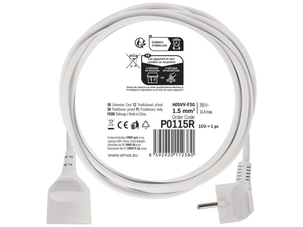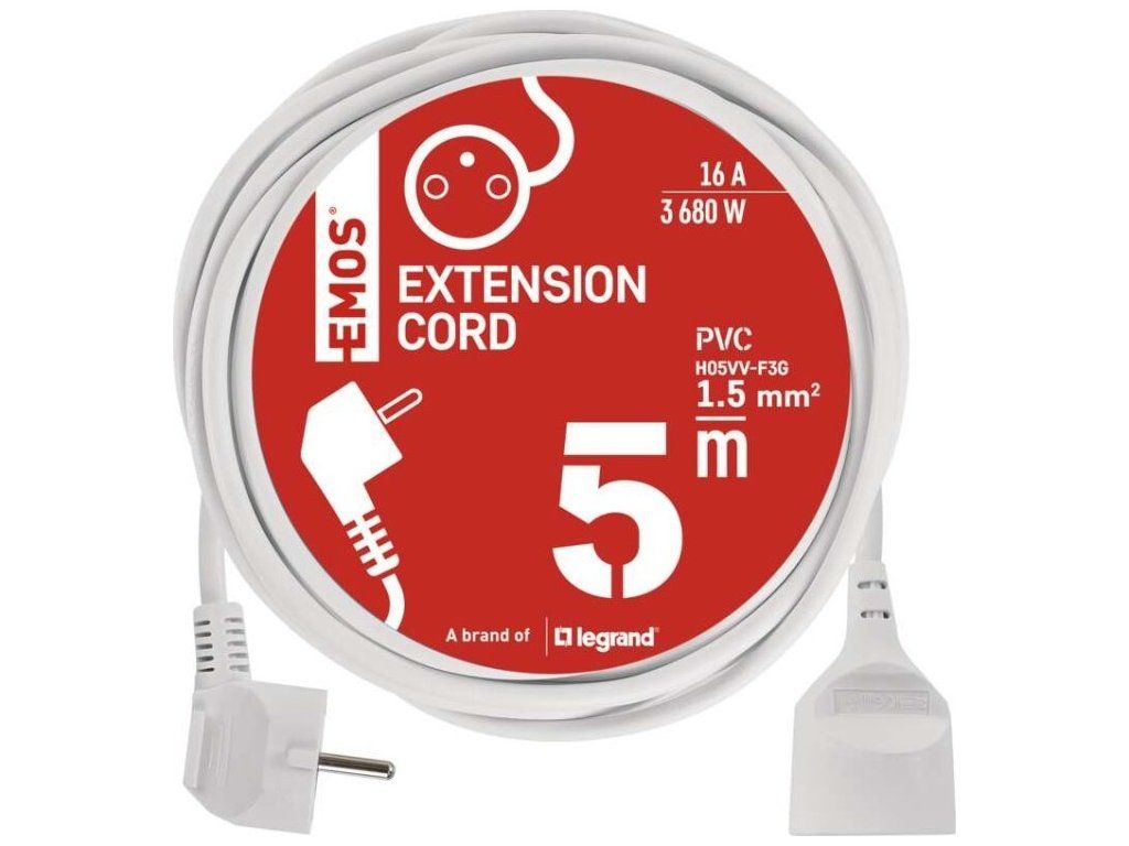 Bílý prodlužovací přívod s jednou zásuvkou - spojka, délkou 5 m a průřezem vodiče 1,5 mm2. Vhodný pro maximální zátěž 16 A max.