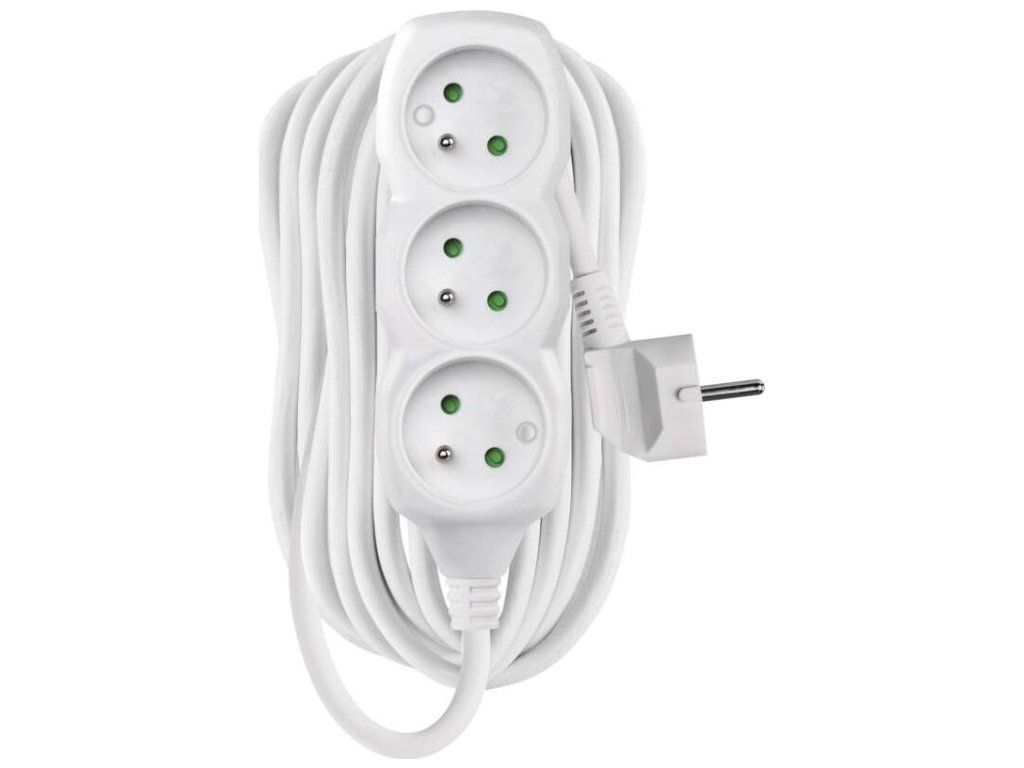 Bílý prodlužovací přívod, 3 zásuvka s délkou 10 m a průřezem vodiče 1 mm2. Vhodný pro maximální zátěž 10 A max.Prodlužovací přívod 10 m na 230 V~ slouží k prodloužení elektrické energie tam, kam pevná zásuvka nedosáhne.Při montáži na stěnu je nutné použít vrut se zápustnou hlavou PZ max. průměr 2,5–3 mm, délka 30–40 mm. V případě použití jiného průměru hrozí poškození plastové části otvoru. Pokud dojde k poškození plastové části otvoru, prodlužovací přívod nepoužívejte.