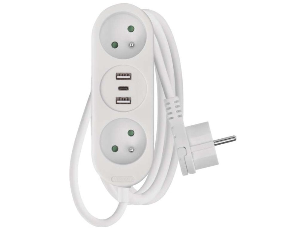 Prodlužovací přívod. 250V~/16A max. 2 zásuvky s dětskými clonkami. 2× USB-A + 1× USB-C ; 5 V DC; total ∑ 3,4 A (17 W) max. Délka přívodního kabelu 2 m. Vodič H05VV-F3G 1,0 mm2.