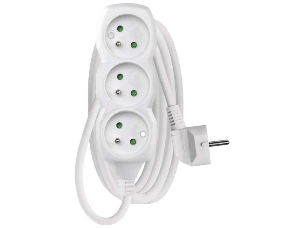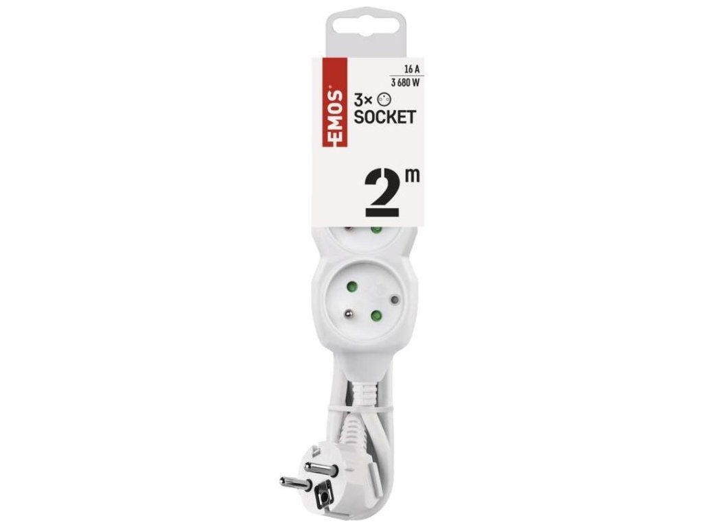 Bílý prodlužovací přívod, 3 zásuvka s délkou 2 m a průřezem vodiče 1 mm2. Vhodný pro maximální zátěž 16 A max.Prodlužovací přívod 2 m na 230 V~ slouží k prodloužení elektrické energie tam, kam pevná zásuvka nedosáhne.Při montáži na stěnu je nutné použít vrut se zápustnou hlavou PZ max. průměr 2,5–3 mm, délka 30–40 mm. V případě použití jiného průměru hrozí poškození plastové části otvoru. Pokud dojde k poškození plastové části otvoru, prodlužovací přívod nepoužívejte.