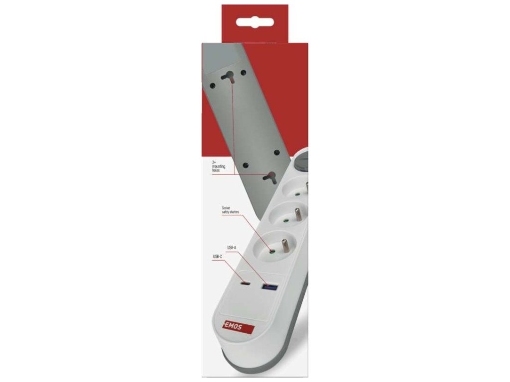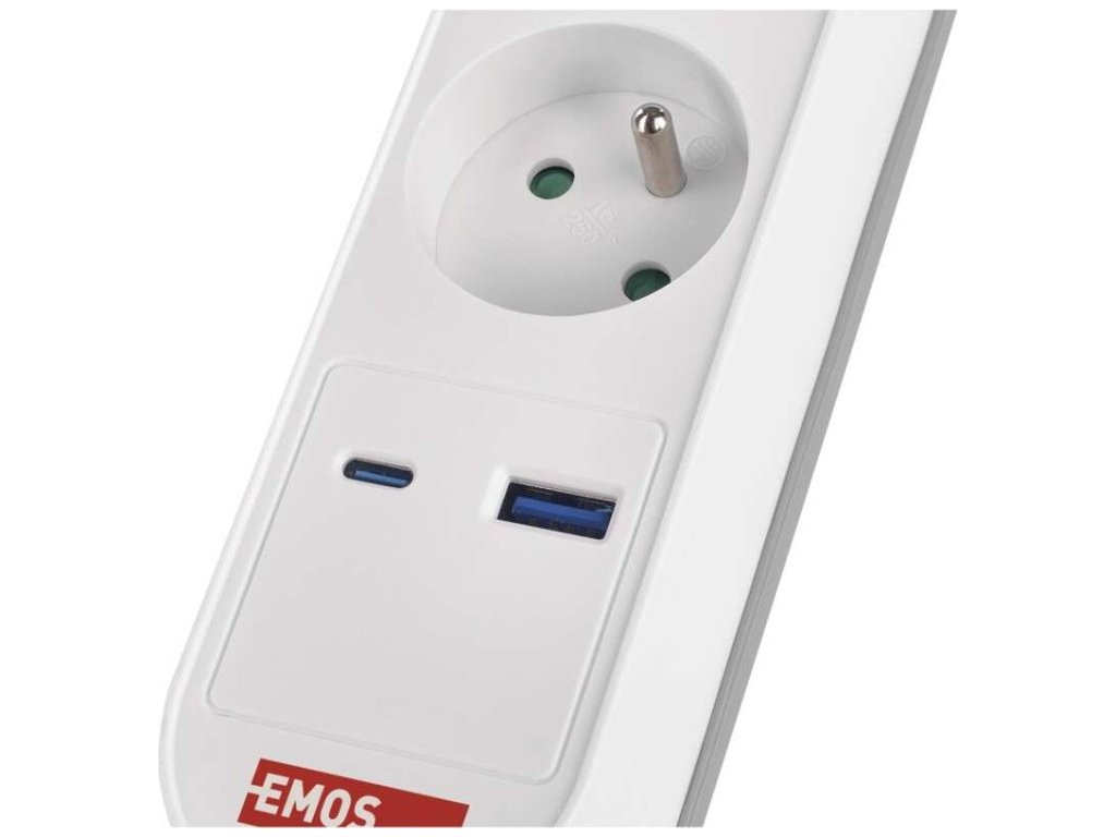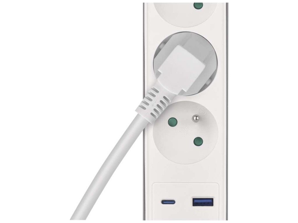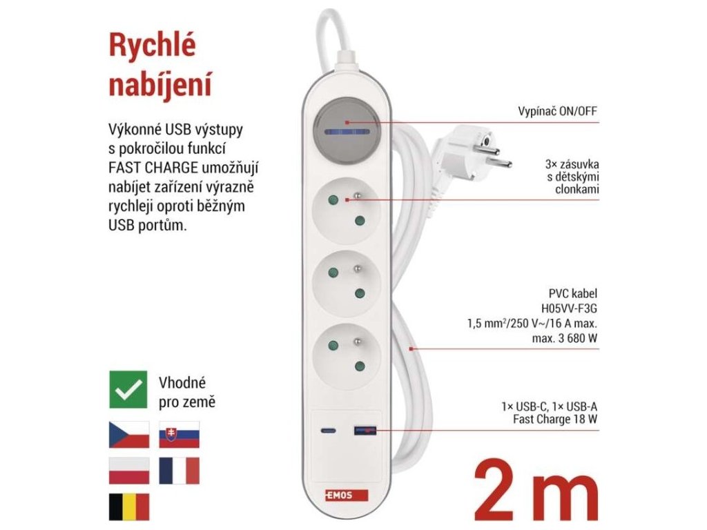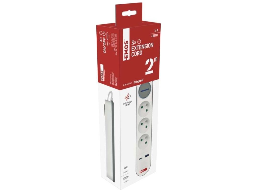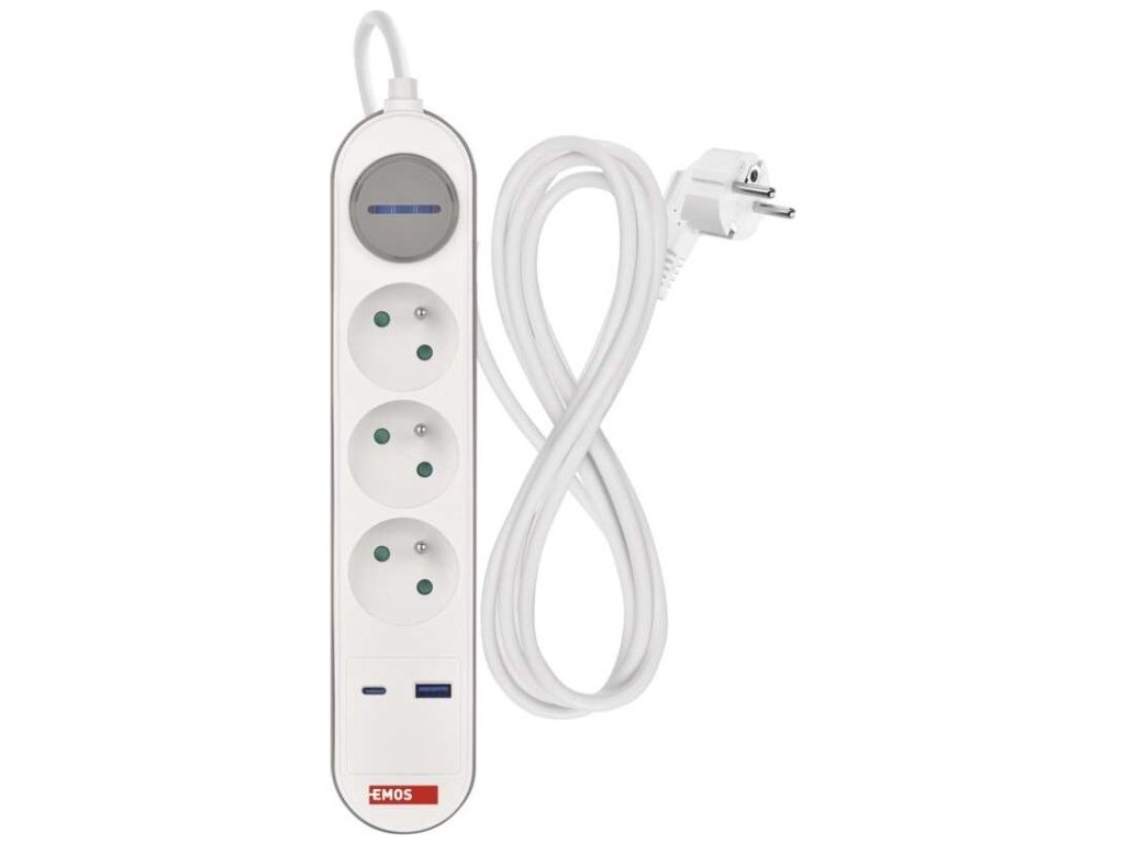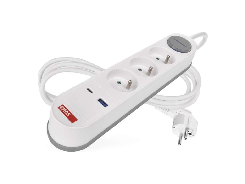 Prodlužovací přívod s vypínačem. 250V~/16A max. 3 zásuvky s dětskými clonkami. USB A+C 3,1 A, 15,5 W max. Délka přívodního kabelu 2 m. Vodič H05VV-F3G 1,5mm2.