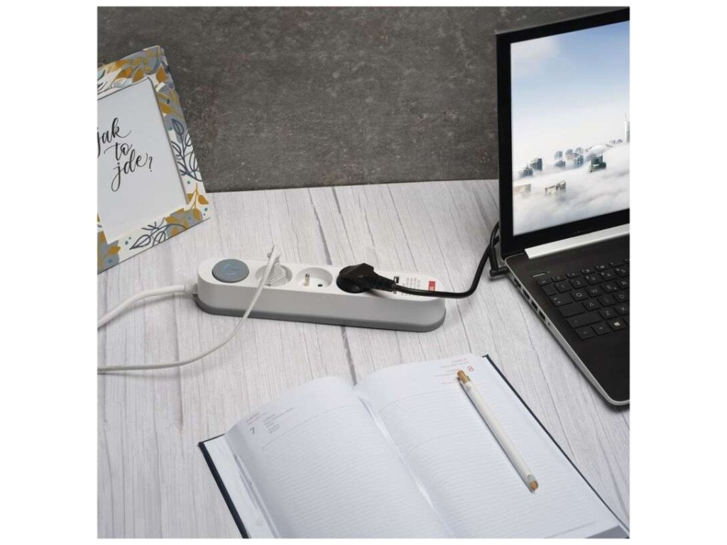 Prodlužovací kabel 2 m / 3 zásuvky / s vypínačem / bílo-šedý / 1×USB-A + 1×USB-C / 1,5 mm2