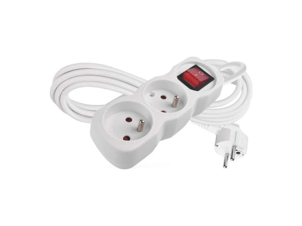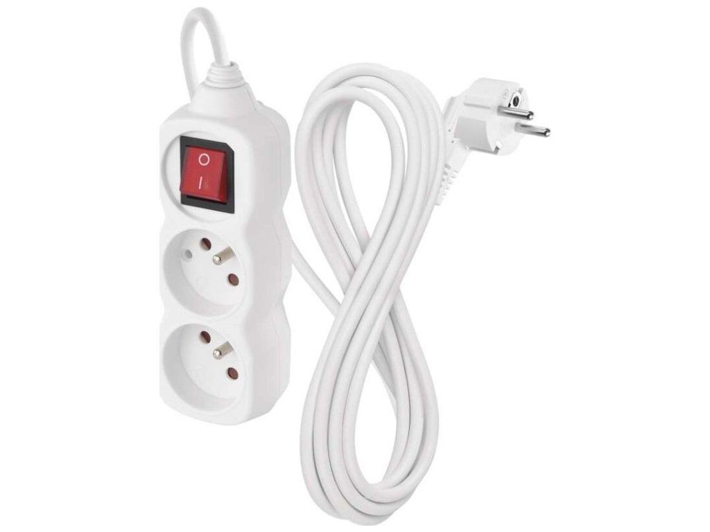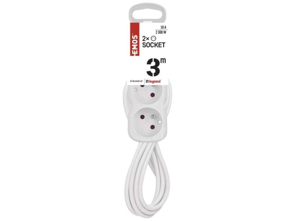 Bílý prodlužovací přívod, 2 zásuvky s dětskými clonkami, vypínačem, délkou 3 m. Průřezem vodiče 1 mm2. Vhodný pro maximální zátěž 10 A max.Při montáži na stěnu je nutné použít vrut se zápustnou hlavou PZ max. průměr 2,5–3 mm, délka 30–40 mm. V případě použití jiného průměru hrozí poškození plastové části otvoru. Pokud dojde k poškození plastové části otvoru, prodlužovací přívod nepoužívejte.