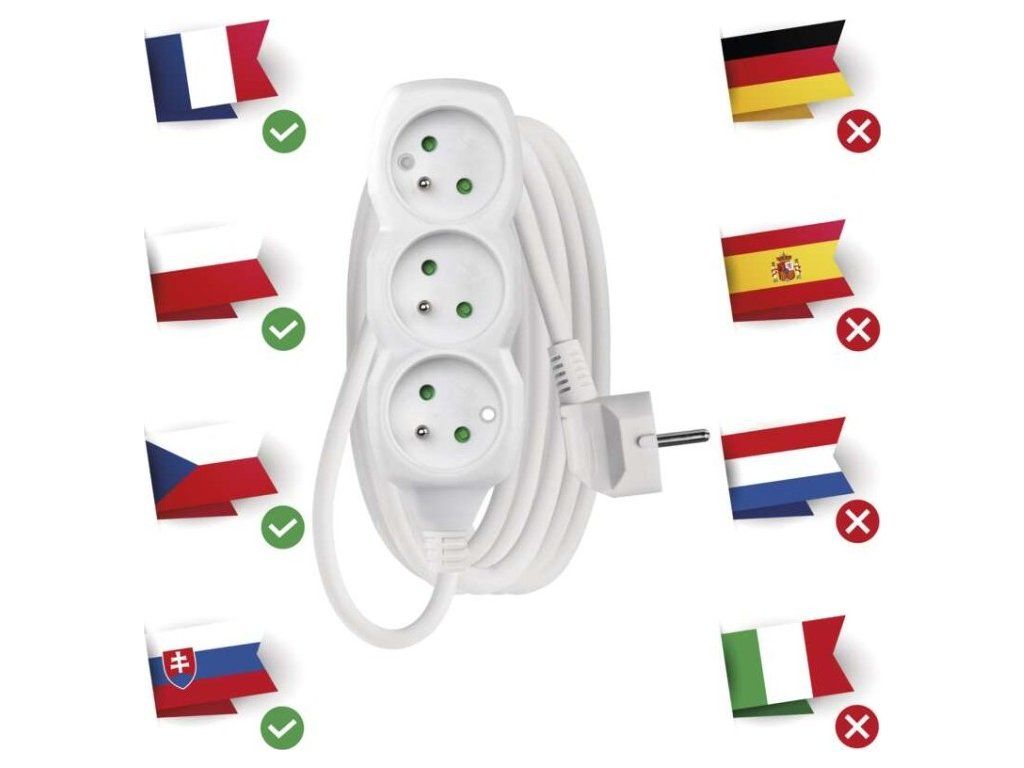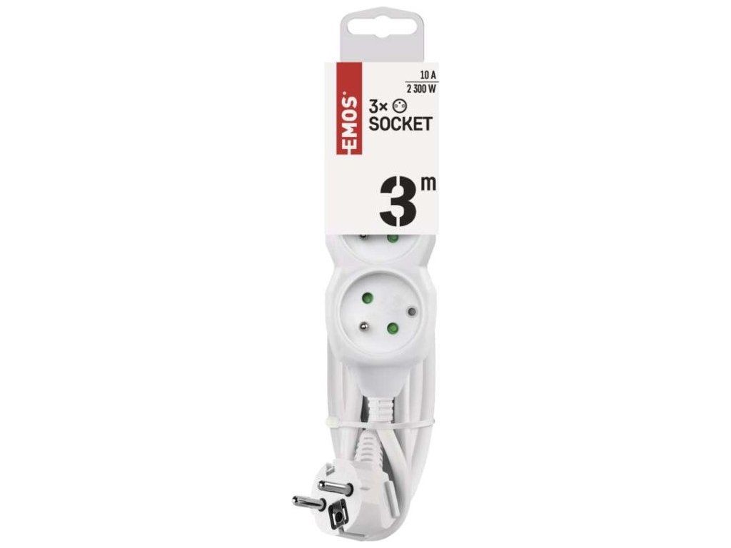 Bílý prodlužovací přívod, 3 zásuvka s délkou 3 m a průřezem vodiče 1 mm2. Vhodný pro maximální zátěž 10 A max.Prodlužovací přívod 3 m na 230 V~ slouží k prodloužení elektrické energie tam, kam pevná zásuvka nedosáhne.Při montáži na stěnu je nutné použít vrut se zápustnou hlavou PZ max. průměr 2,5–3 mm, délka 30–40 mm. V případě použití jiného průměru hrozí poškození plastové části otvoru. Pokud dojde k poškození plastové části otvoru, prodlužovací přívod nepoužívejte.