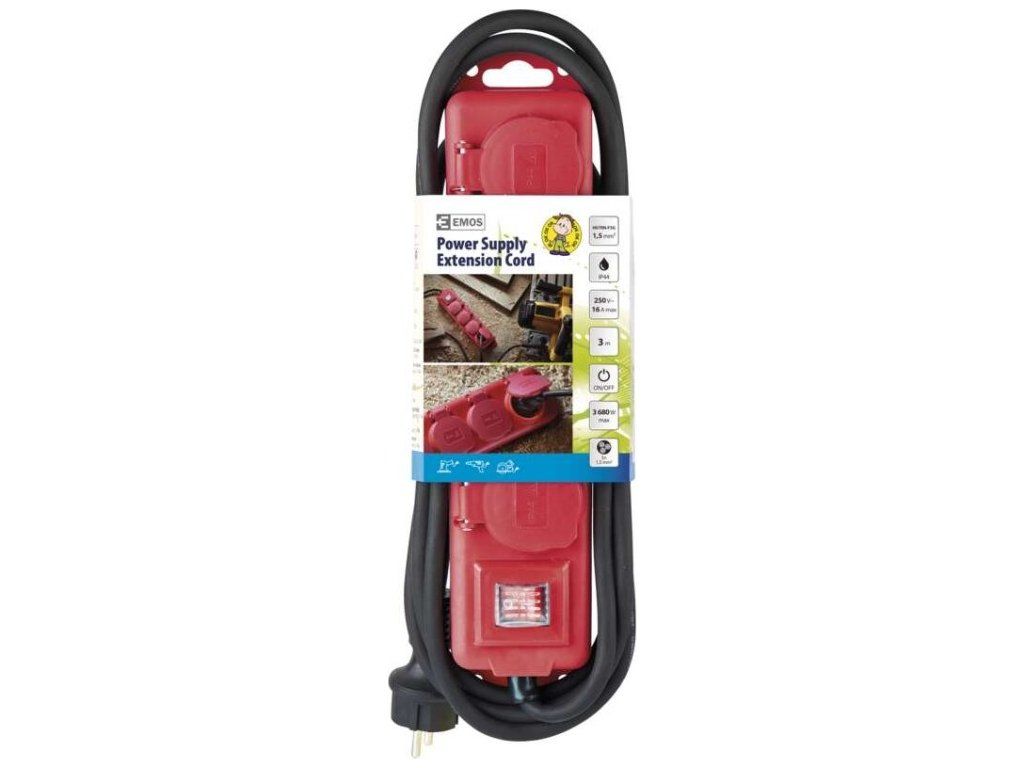 Prodlužovací kabel 3 m / 4 zásuvky / s vypínačem / černo-červený / guma-neopren / 1,5 mm2