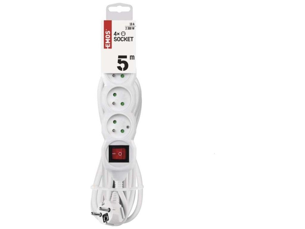 Bílý prodlužovací přívod, 4 zásuvka s vypínačem, délkou 5 m a průřezem vodiče 1 mm2. Vhodný pro maximální zátěž 10 A max.Prodlužovací přívod 5 m na 230 V~ slouží k prodloužení elektrické energie tam, kam pevná zásuvka nedosáhne.Při montáži na stěnu je nutné použít vrut se zápustnou hlavou PZ max. průměr 2,5–3 mm, délka 30–40 mm. V případě použití jiného průměru hrozí poškození plastové části otvoru. Pokud dojde k poškození plastové části otvoru, prodlužovací přívod nepoužívejte.