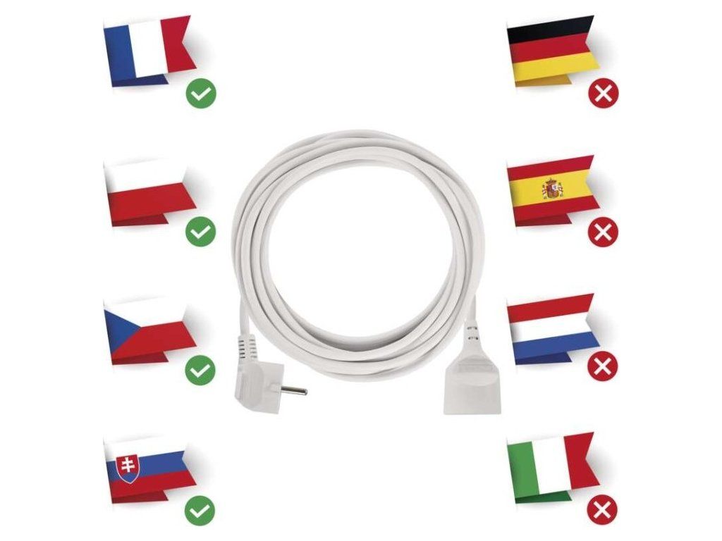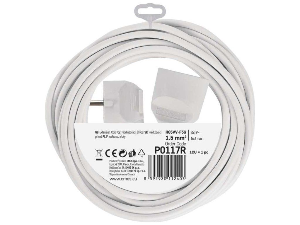 Bílý prodlužovací přívod s jednou zásuvkou - spojka, délkou 7 m a průřezem vodiče 1,5 mm2. Vhodný pro maximální zátěž 16 A max.