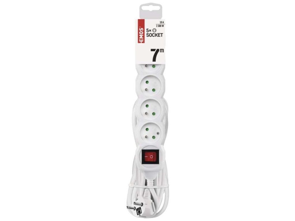 Bílý prodlužovací přívod, 5 zásuvka s vypínačem, délkou 7 m a průřezem vodiče 1 mm2. Vhodný pro maximální zátěž 10 A max.Prodlužovací přívod 7 m na 230 V~ slouží k prodloužení elektrické energie tam, kam pevná zásuvka nedosáhne.Při montáži na stěnu je nutné použít vrut se zápustnou hlavou PZ max. průměr 2,5–3 mm, délka 30–40 mm. V případě použití jiného průměru hrozí poškození plastové části otvoru. Pokud dojde k poškození plastové části otvoru, prodlužovací přívod nepoužívejte.