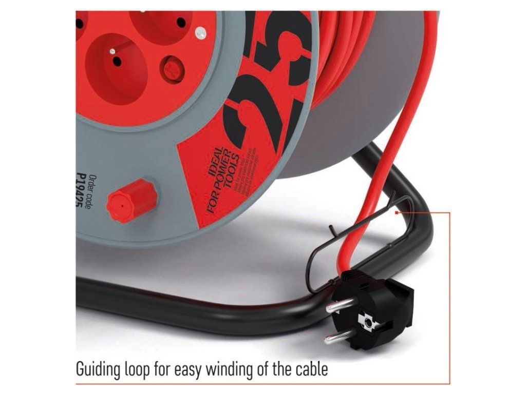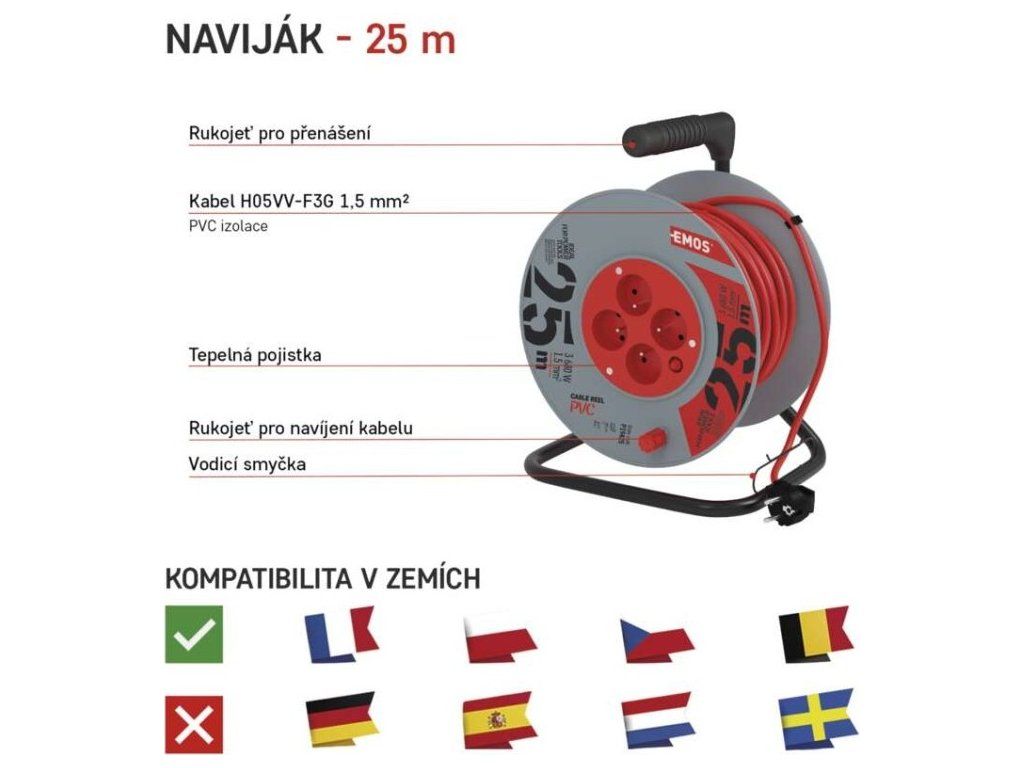 Kvalitní naviják prodlužovacího přívodu. Je ideální pro prodloužení napájecí sítě 230V~. Jeho výhodou je pohodlná manipulace díky bubnu.
