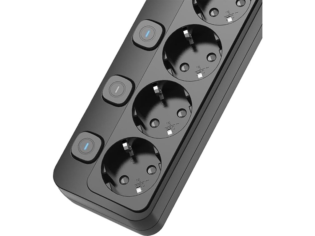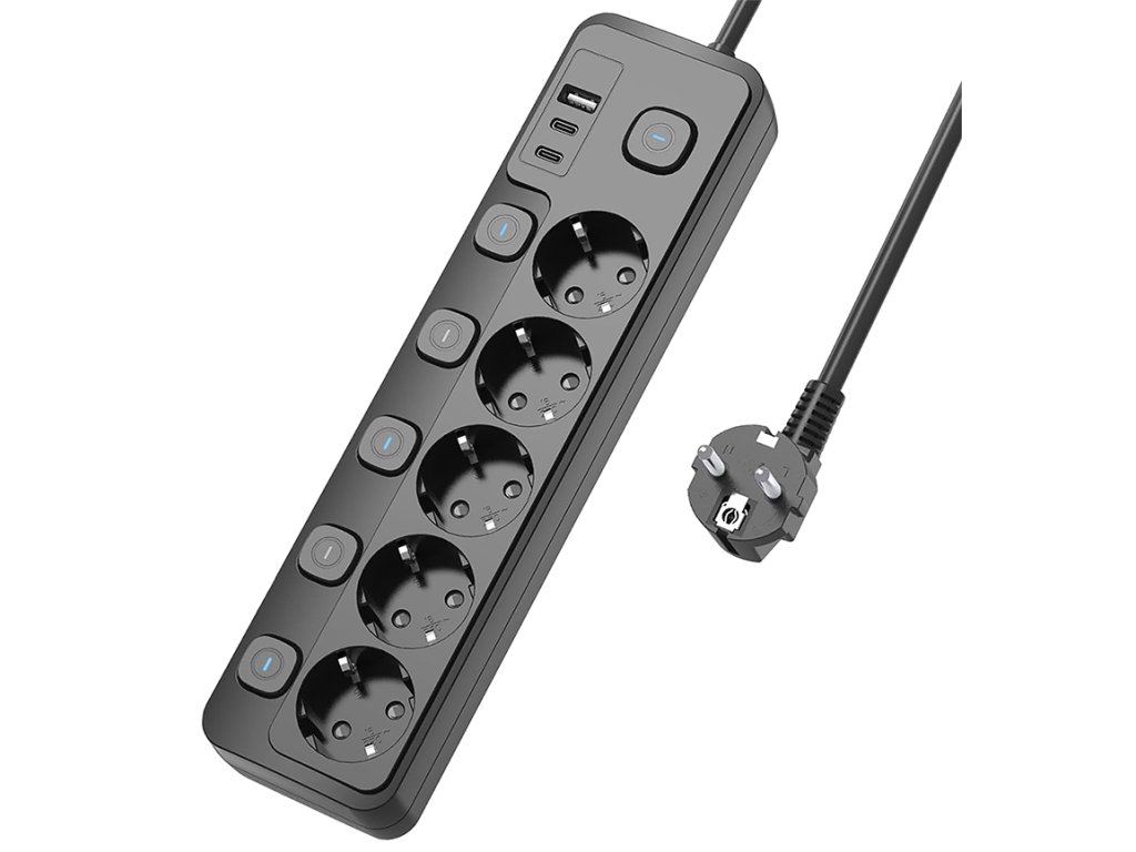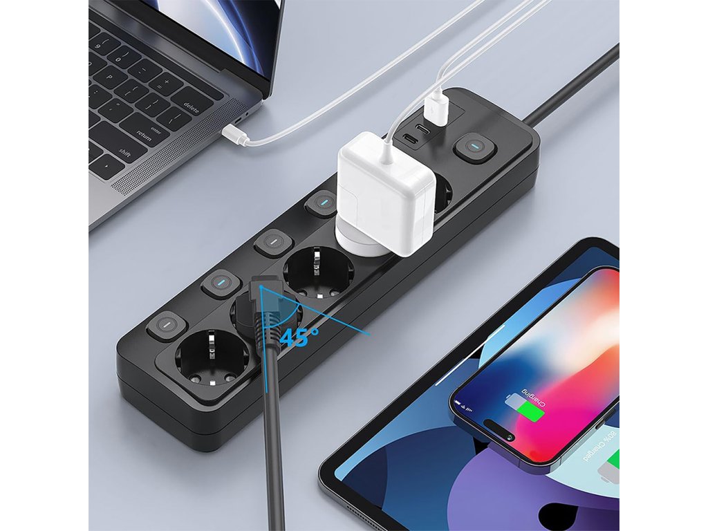 Prodlužovací zásuvka • rozbočovač • 5 x AC (230V, 16A) výstup • 1 x USB-A (5V/3A, 9V/2A, 12V/1,5A) • 2 x USB-C (5V/3A, 9V/2,22A, 12V/1,67A) • hlavní tlačítko ON/OFF • kompaktní rozměry a design • individuální zapnutí/vypnutí každého AC výstupu • délka kabelu 1,5 m • možnost nabíjení až 8 zařízení současně