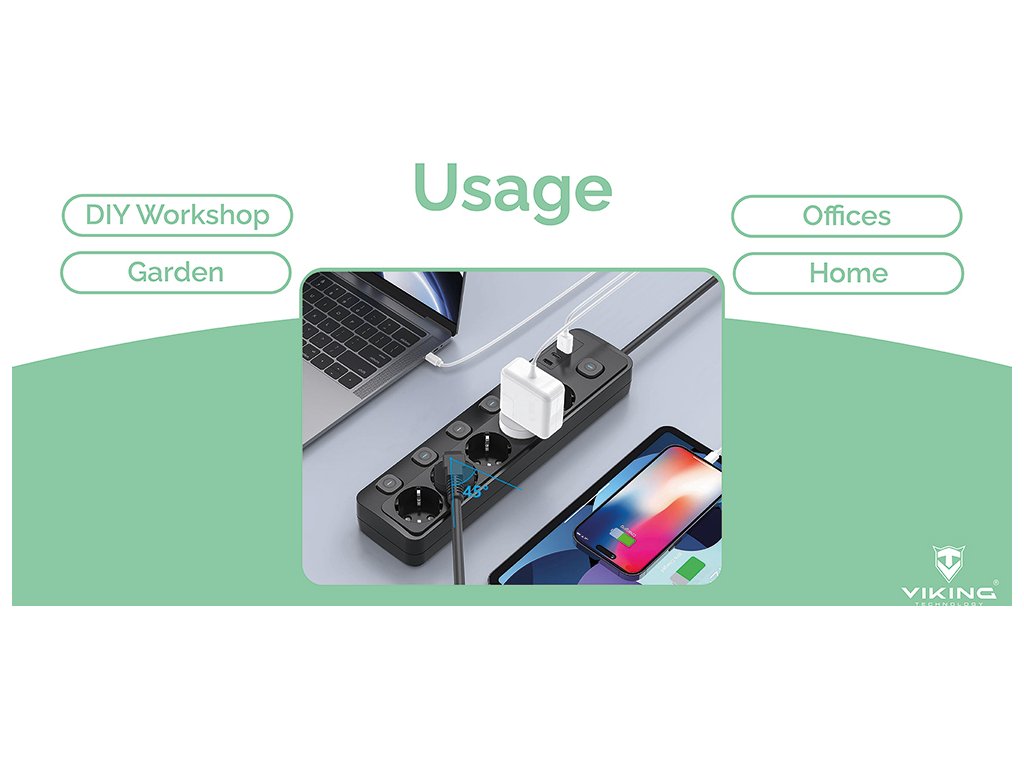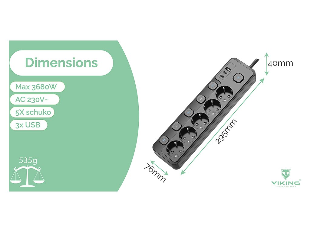 Prodlužovací zásuvka Viking YC53 disponuje 5 AC výstupy a 3 USB porty, což umožňuje nabíjení až 8 zařízení najednou. Díky individuálním tlačítkům ON/OFF pro každý výstup a kompaktnímu designu s kabelem o délce 1,5 m je ideální pro použití ve vaší domácnosti nebo kanceláři.