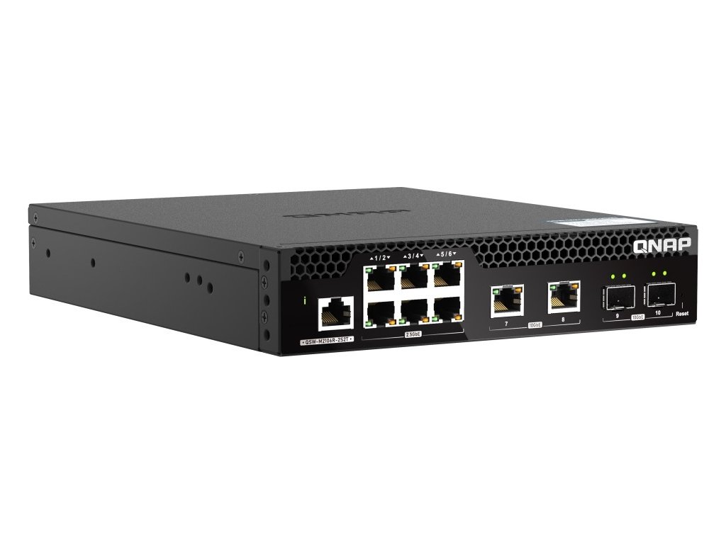Zařízení QSW-M2106R-2S2T je webově řízený přepínač (switch) úrovně 2 se dvěma porty 10GbE SFP+, dvěma porty 10GbE RJ45 a šesti porty 2,5GbE RJ45. Zařízení QSW-M2106R-2S2T podporuje přepínání a správu sítě úrovně 2 (L2) prostřednictvím uživatelsky vstřícného webového rozhraní, nabízí flexibilní nasazení v hybridních vysokorychlostních síťových prostředích a poskytuje řešení pro správu sítě na základní úrovni, které zvládnou používat i ti, kdo nepatří mezi profesionály v oboru IT. Díky konstrukci s poloviční šířkou mohou být dva QSW-M2106R-2S2T instalovány do 1U rackového prostoru.