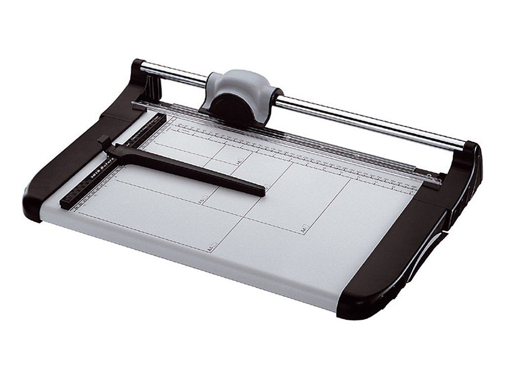 Kvalitní kolečková řezačka s pevnou kovovou základnou a řeznou hlavou umístěnou na kovové tyči, určena pro formát A4. Pracovní stůl je vybaven natištěnými měřítky a posuvnou zarážkou souběžnou s přímkou řezu. Díky rotačnímu noži z tvrzené nerezové oceli jsou řezačky KW Trio vhodné pro řezání i více listů nebo archů.