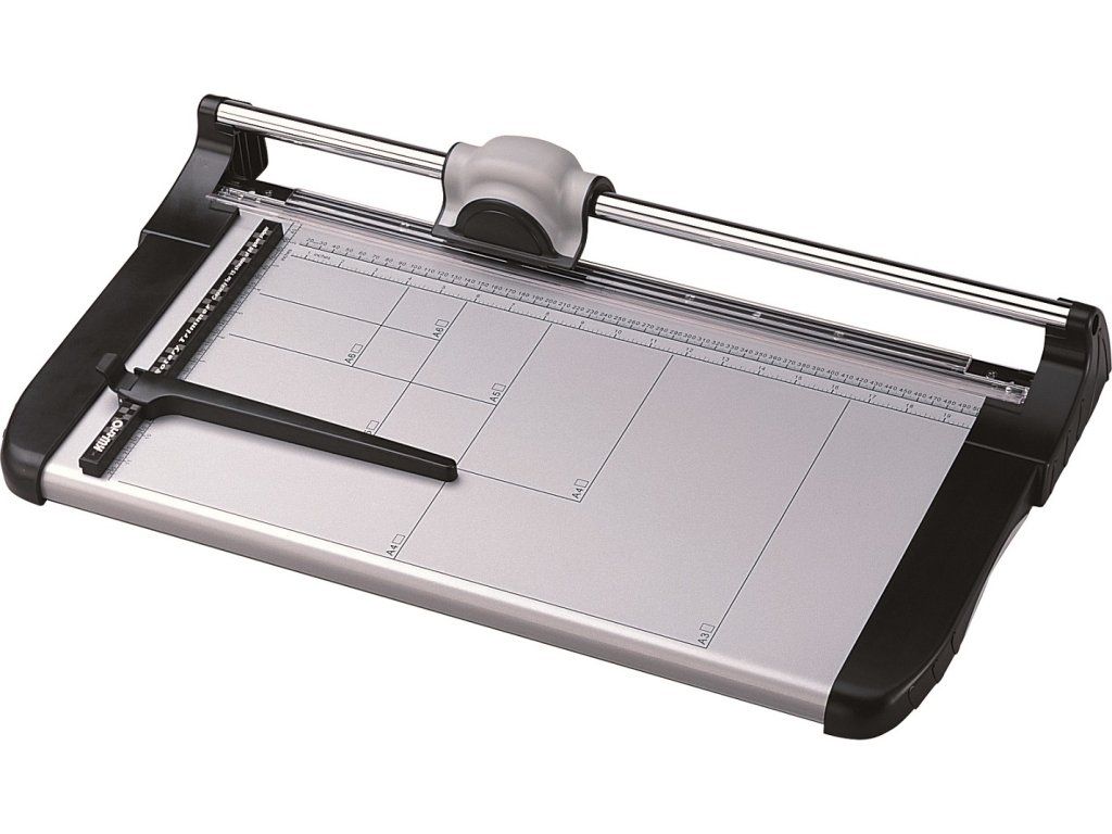 Kvalitní kolečková řezačka s pevnou kovovou základnou a řeznou hlavou umístěnou na kovové tyči, určena pro formát A3+. Pracovní stůl je vybaven natištěnými měřítky a posuvnou zarážkou souběžnou s přímkou řezu. Díky rotačnímu noži z tvrzené nerezové oceli jsou řezačky KW Trio vhodné pro řezání i více listů nebo archů.