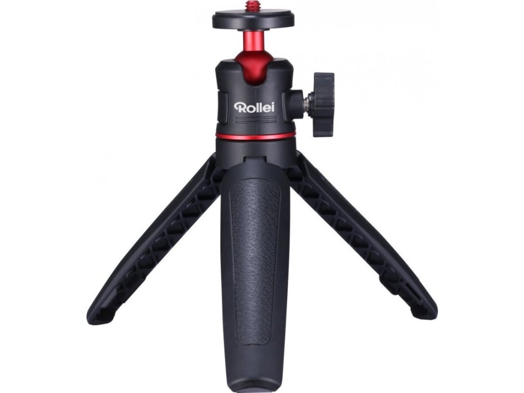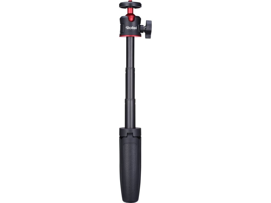 Kompaktní stativ s 360° otočnou kulovou hlavou určený pro akční kamery Rollei, mobilní telefony a kompaktní fotoaparáty. Pomocí trojnožky jej lze použít jako klasický stativ, ve složeném stavu lze jednoduše natáčet stabilizovaná videa z ruky, nebo můžete využít teleskopického vysunutí na délku až 25,2 centimetrů a používat stativ jako selfie tyčku. Nosnost stativu je 1200 g.