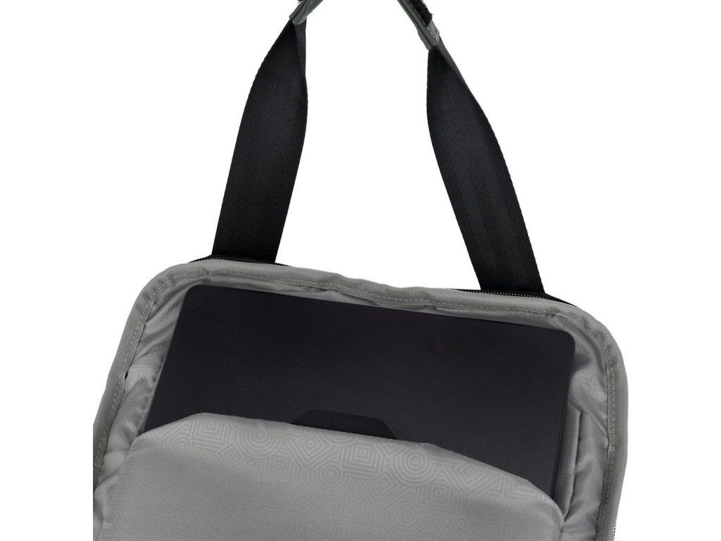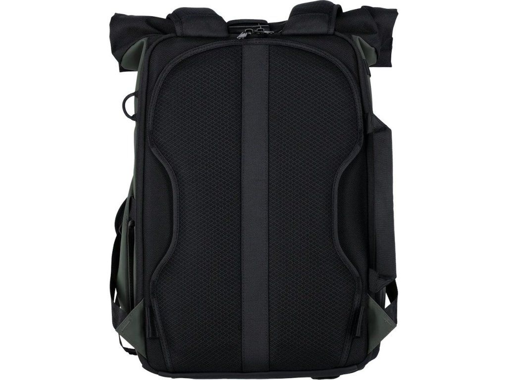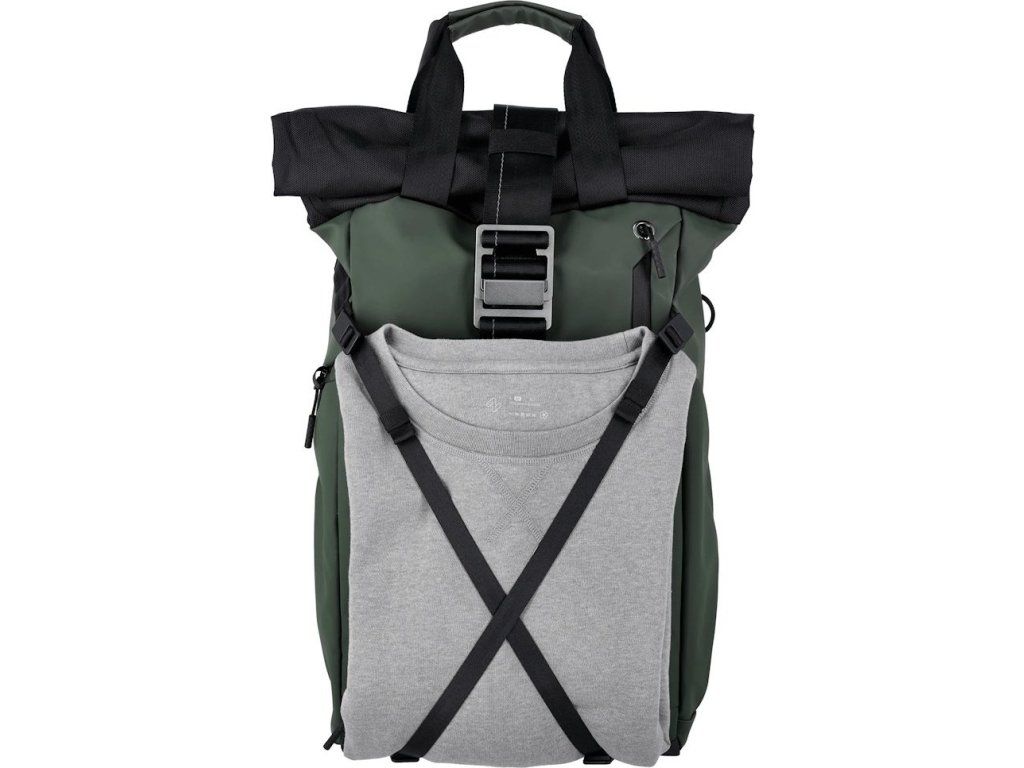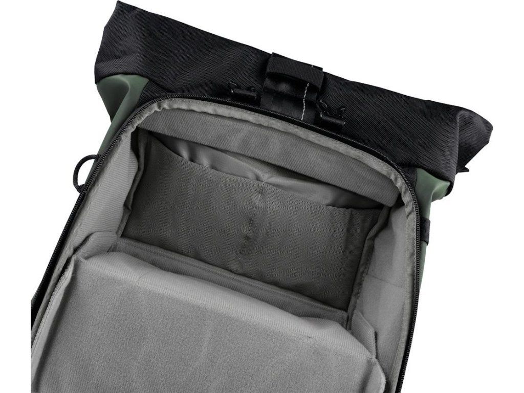 Úložný prostor doplňuje oddíl na notebook o rozměrech 350 × 260 × 20 mm a samostatné pouzdro na tablet 280 × 230 × 20 mm. Rolovací vrchní část zajišťuje variabilní přizpůsobení objemu od 12 litrů po 32 litrů. Batoh je vyroben z ekologického materiálu s obsahem recyklovaného plastu.