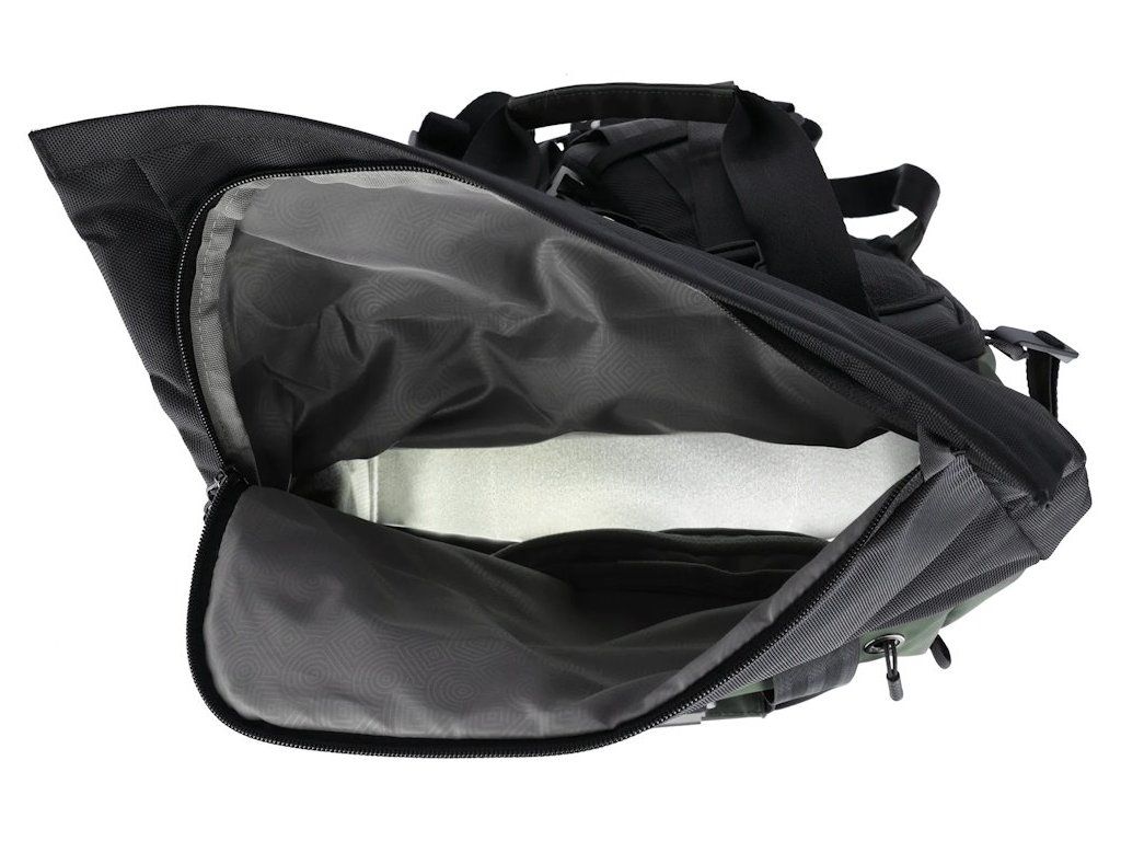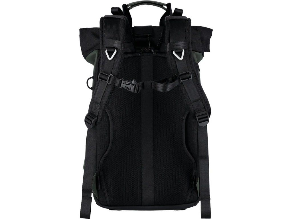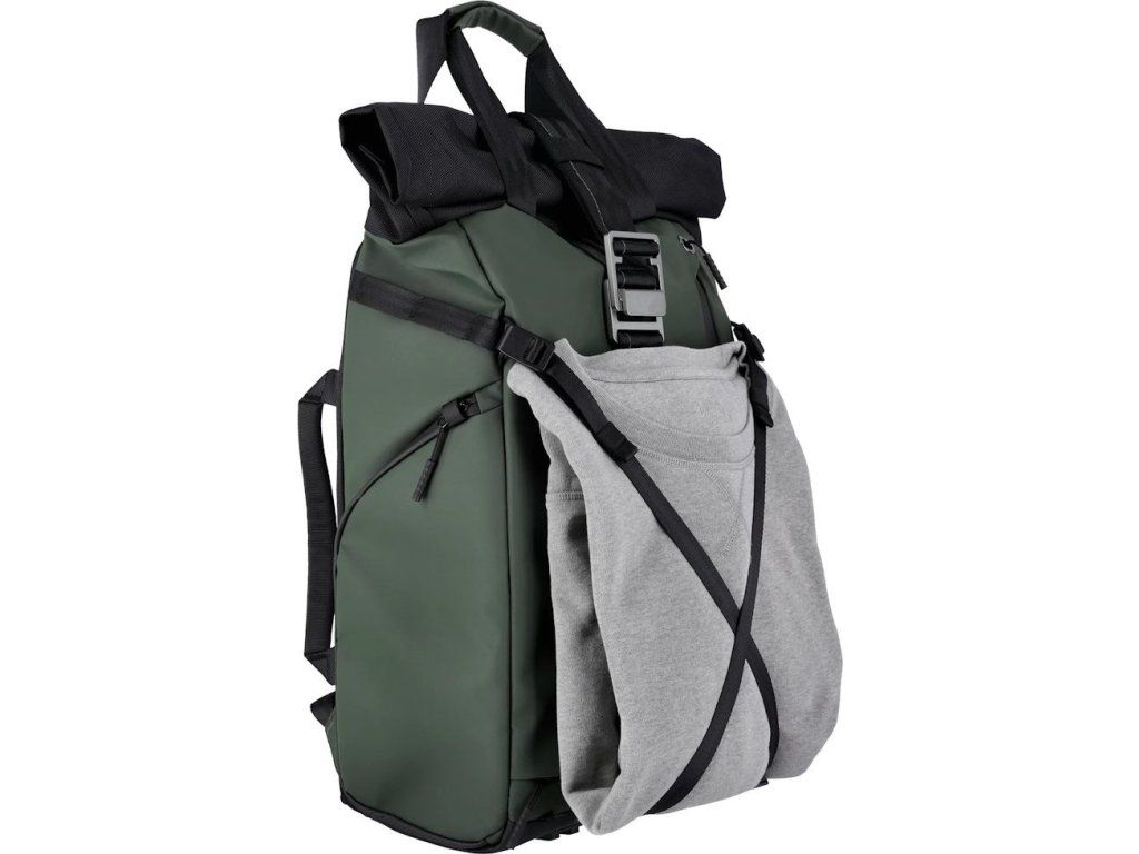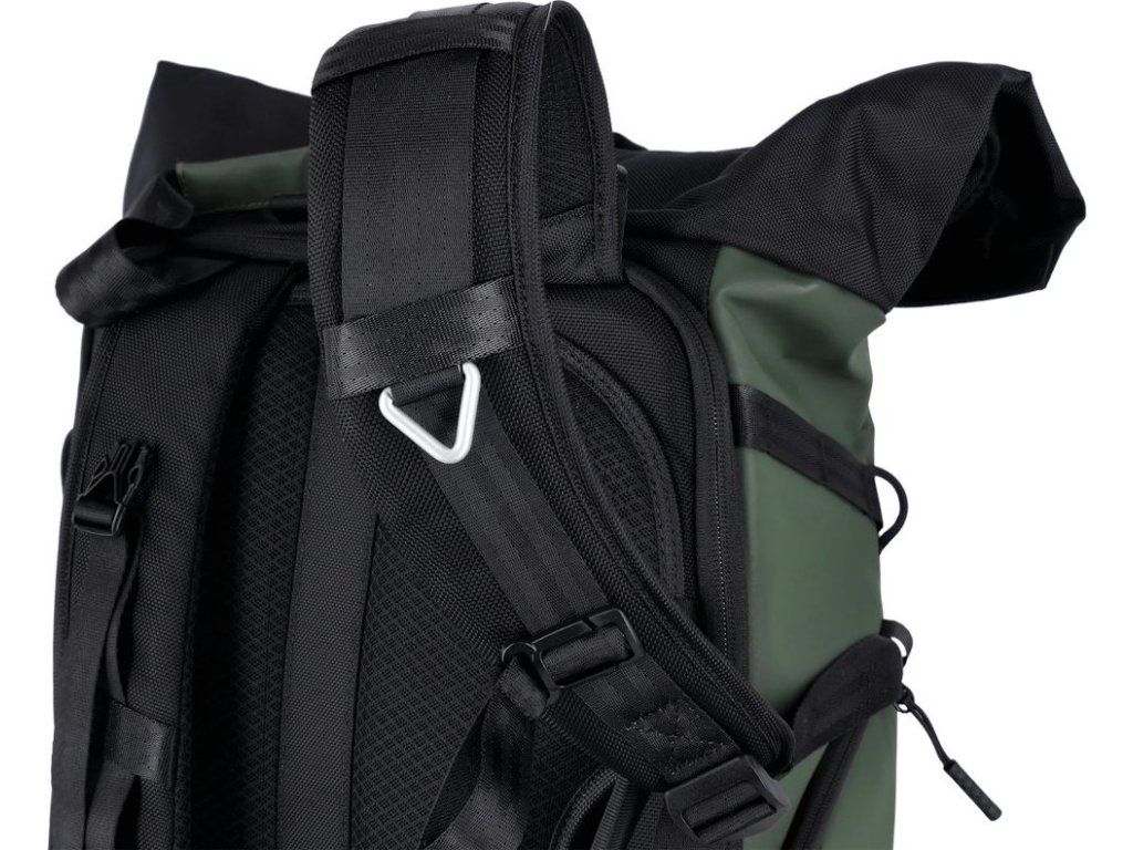 Úložný prostor doplňuje oddíl na notebook o rozměrech 350 × 260 × 20 mm a samostatné pouzdro na tablet 280 × 230 × 20 mm. Rolovací vrchní část zajišťuje variabilní přizpůsobení objemu od 12 litrů po 32 litrů. Batoh je vyroben z ekologického materiálu s obsahem recyklovaného plastu.