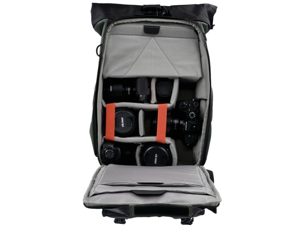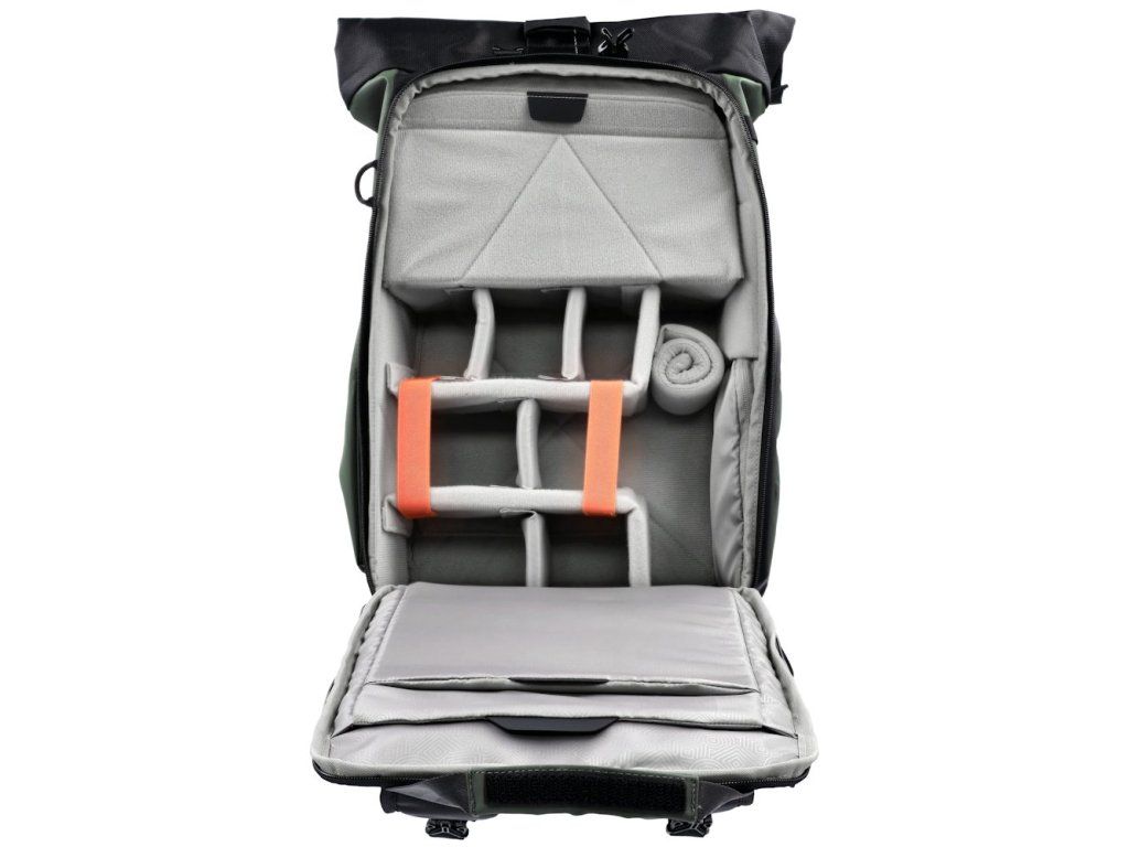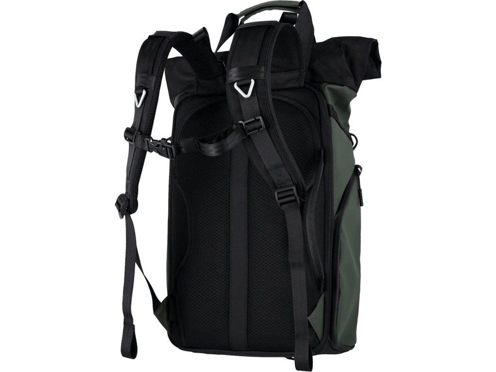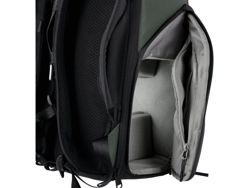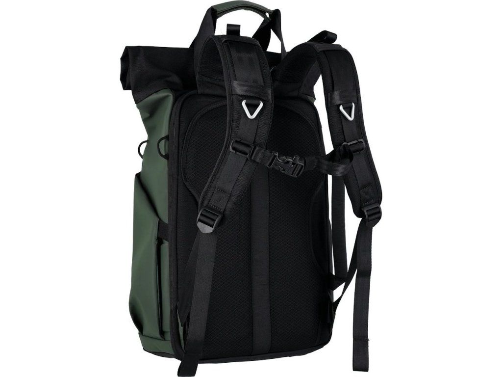Univerzální fotobatoh v tmavě zelené barvě s flexibilním úložným prostorem a rolovacím vrchem pro fotografy, cestovatele a každodenní použití.