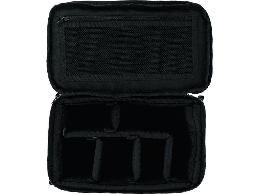 Výbava: flexibilně nastavitelné přepážky, elastické popruhy, síťová kapsa, úchytové rukojeti, ramenní popruh, úložný obal