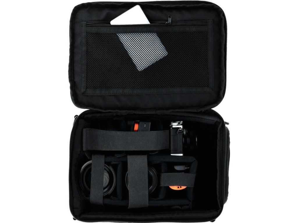 Vnitřní prostor s objemem přibližně 6 litrů poskytuje dostatečnou ochranu pro menší fotoaparáty a objektivy. Flexibilní přepážky a elastické popruhy zajišťují, že vybavení zůstane na svém místě a je chráněno před poškozením během transportu. Přístup k technice je řešen praktickým celootevíracím horním víkem.