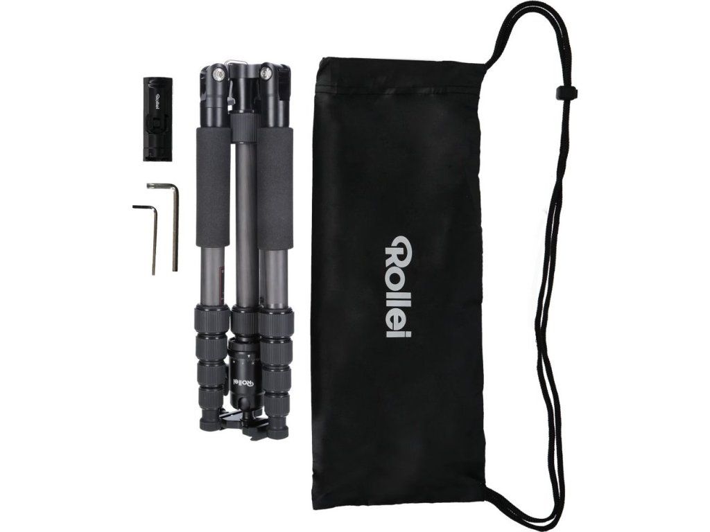 Odlehčený karbonový stativ od společnosti Rollei nabízí hlavu s rychloupínací destičkou. Základnou stativu jsou gumové nožičky, gumové koncovky nožek můžete sejmout a pro lepší stabilitu jej můžete zapíchnout do země. Nožičky stativu jsou výsuvné, ve složeném stavu mají délku 34 cm, v rozloženém 142 cm. Celková hmotnost činí 980 g a stativ unese až 8 kg! Tento kompaktní a robustní stativ ocení každý fotograf. Může být použit také jako monopod.