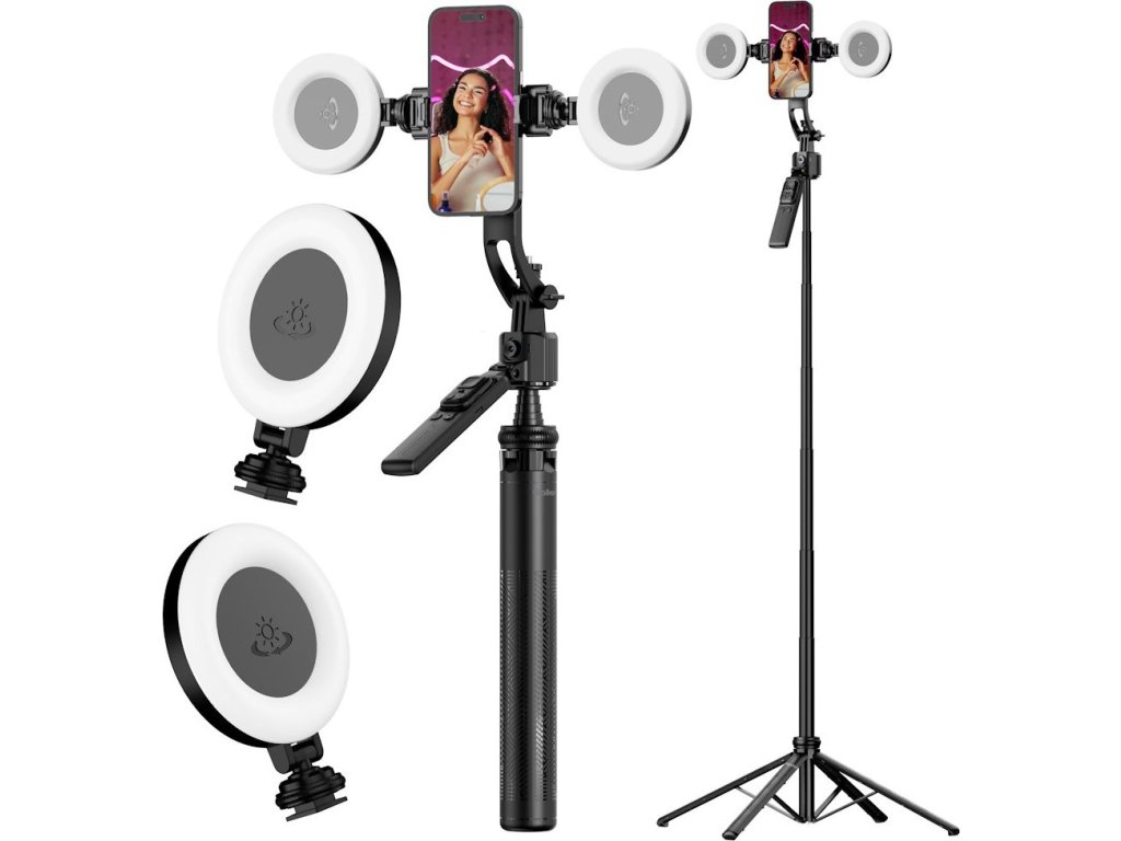 Pokročilý stativ s AI sledováním tváře a profesionálním LED osvětlením pro dokonalé selfie a vlog natáčení.