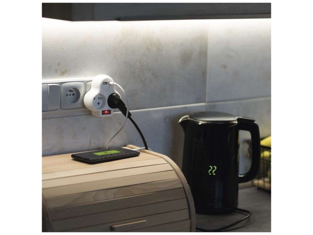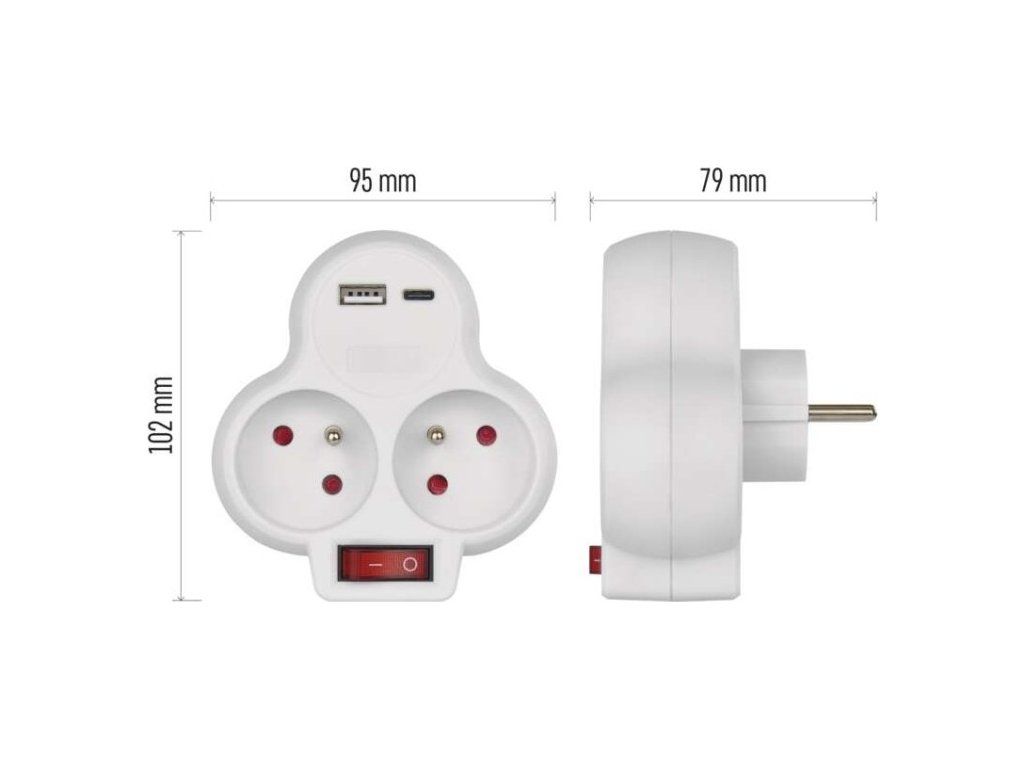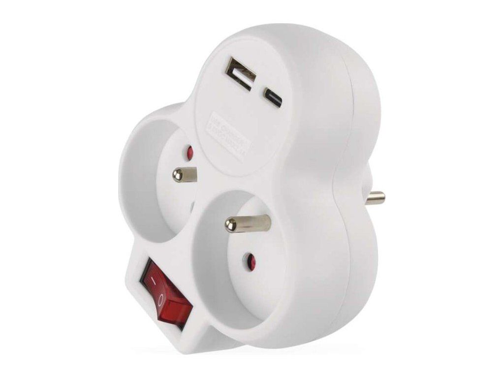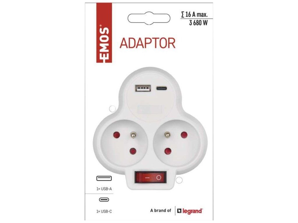 Adaptor dvojnásobný rozbočovací s vypínačem a USB výstupem A+C. Max. ∑16 A. 2× USB ∑3,4 A max (17W).