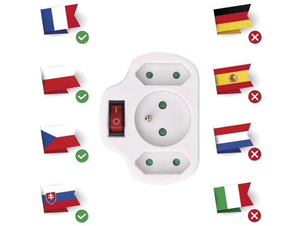 Rozbočovací zásuvka 2× plochá + 1× kulatá s vypínačem, bílá