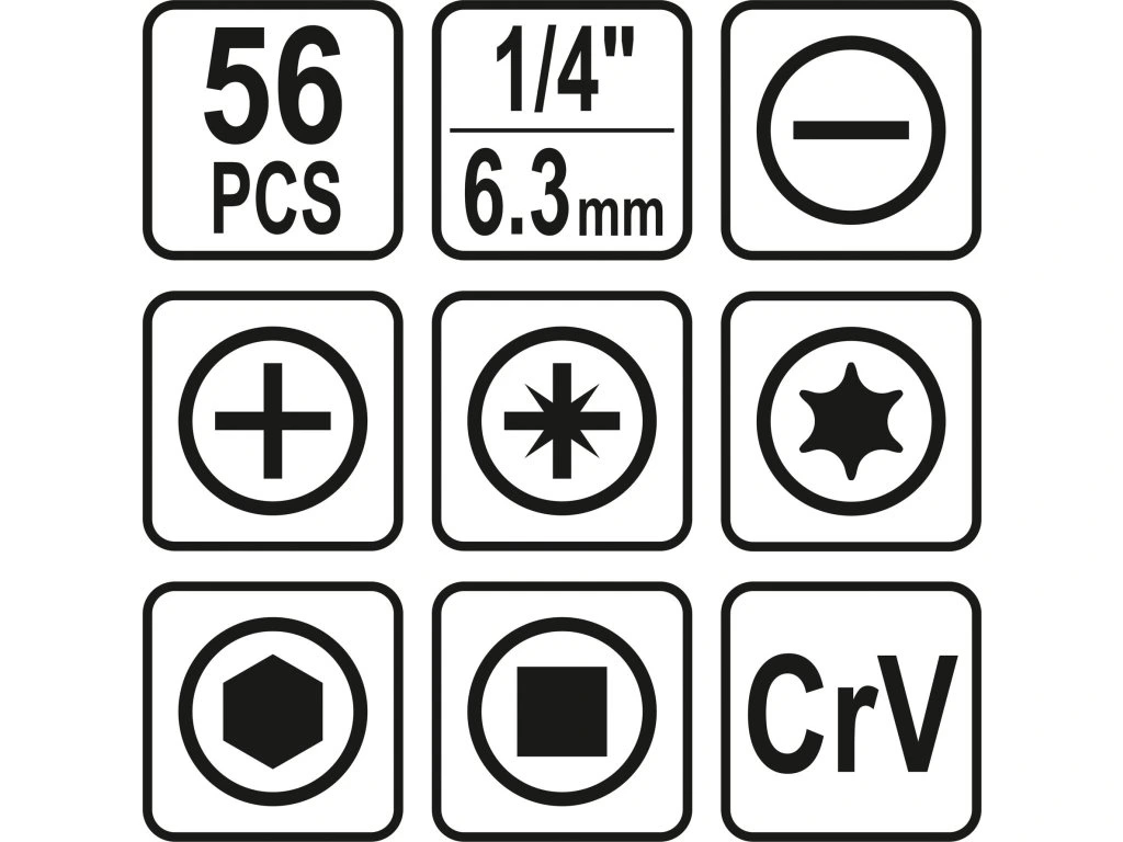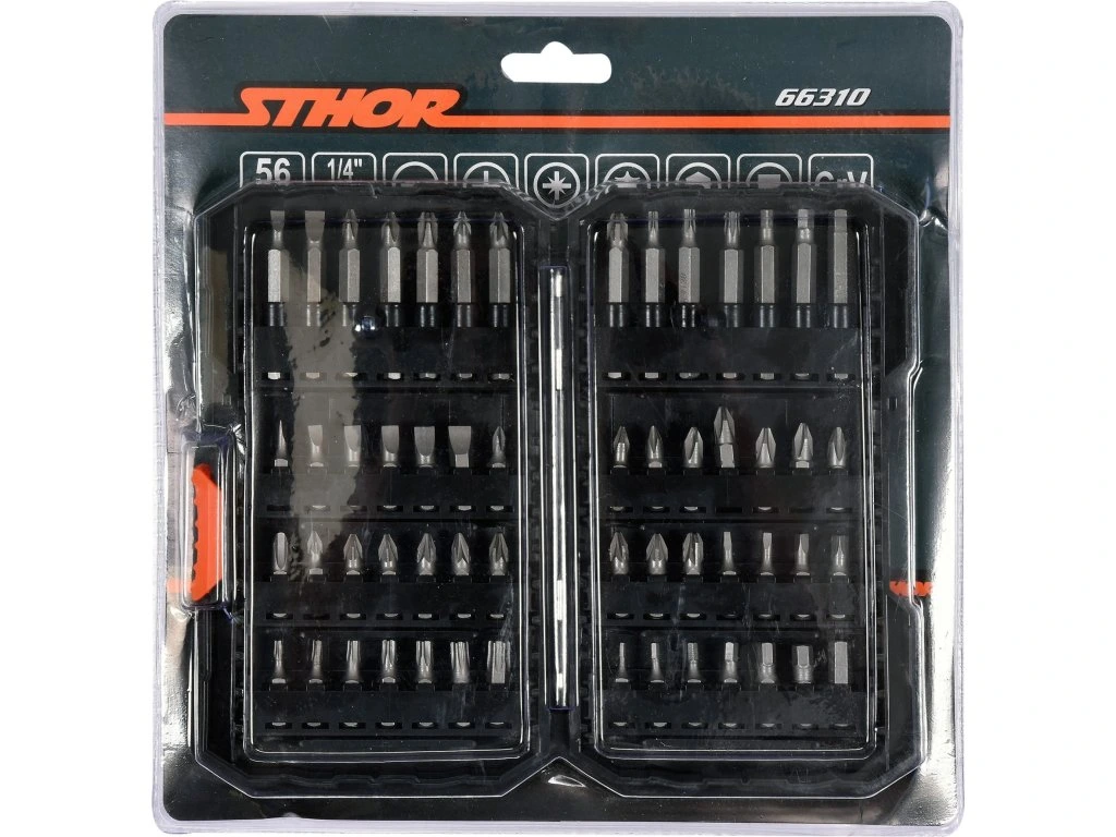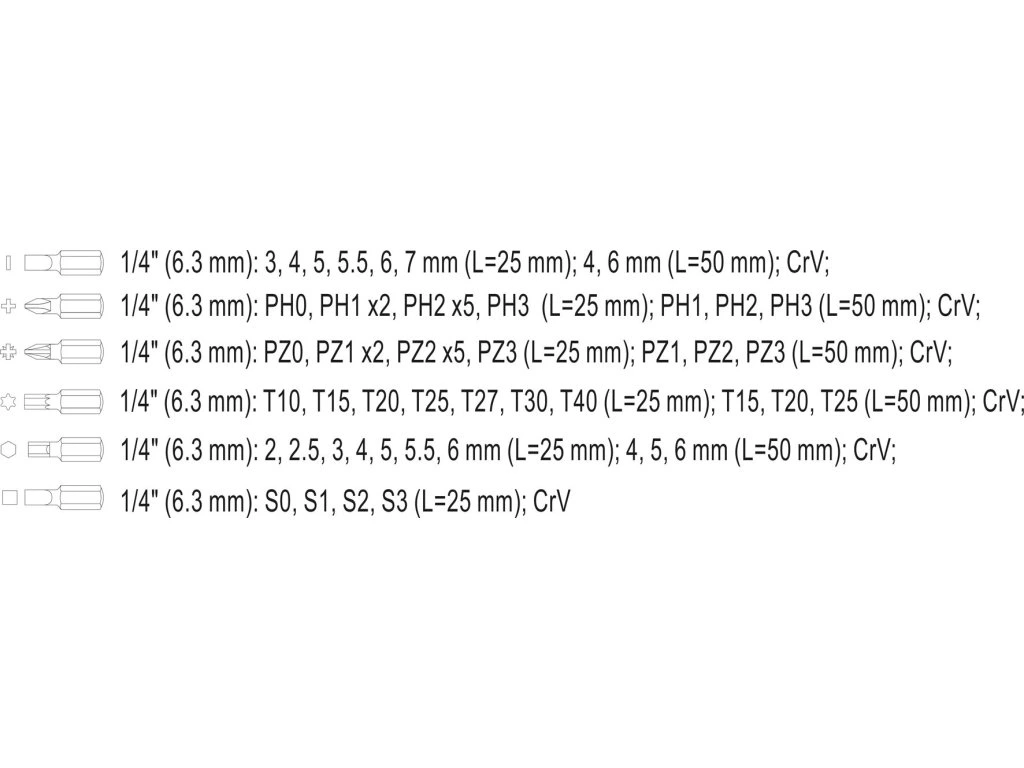Bit 25mm šroubovací plochý: 3; 4; 5; 5,5; 6; 7 mm Bit 25mm šroubovací Ph: Ph0; 2x Ph1; 5x Ph2 Bit 25mm šroubovací Pz: Pz0; 2x Pz1; 5x Pz2 Bit 25mm šroubovací Torx: T10; T15; T20; T25; T27; T30; T40 Bit 25mm šroubovací Square: S0; S1; S2; S3 Bit 25mm šroubovací Hex: 2; 2,5; 3; 4; 5; 5,5; 6 mm Bit 50mm šroubovací plochý: 4; 6 mm Bit 50mm šroubovací Ph: Ph1; Ph2; Ph3 Bit 50mm šroubovací Pz: Pz1; Pz2; Pz3 Bit 50mm šroubovací Torx: T15; T20; T25 Bit 50mm šroubovací Hex: 4; 5; 6 mmDoplňkové parametry