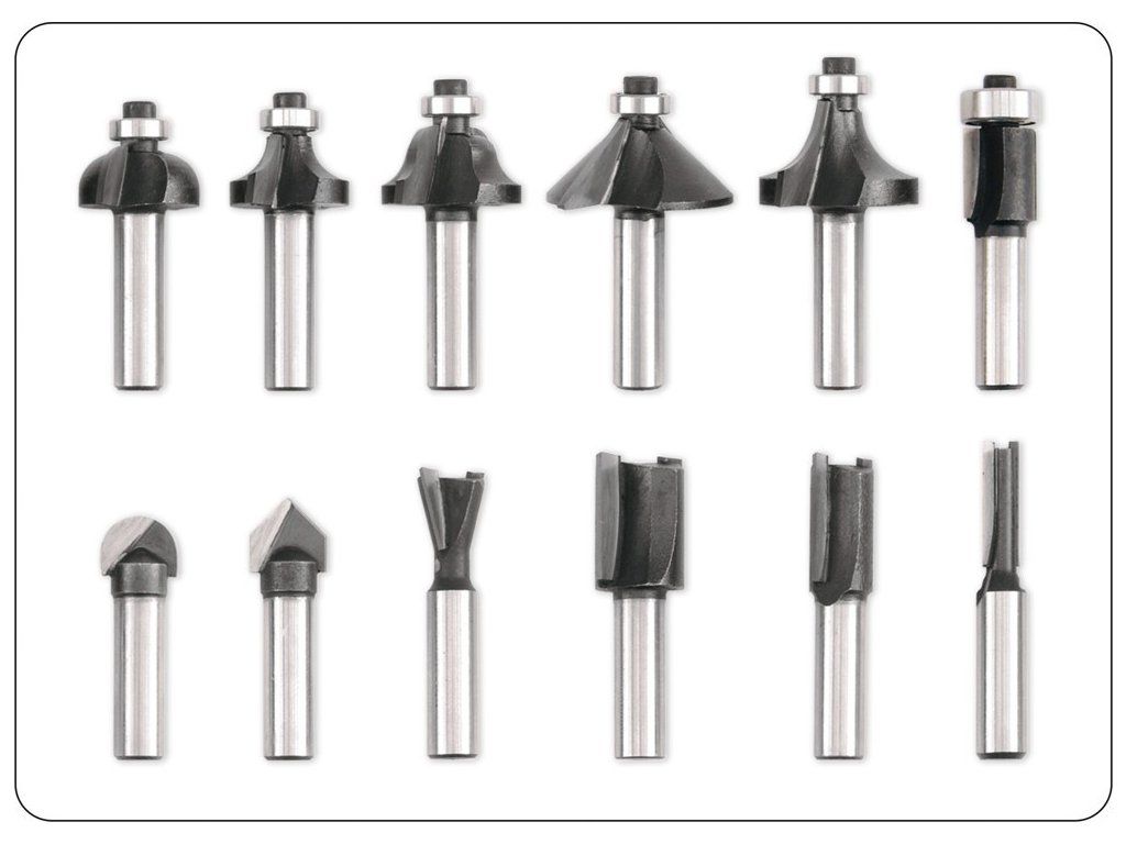 Sada dvanácti různých tvarových frézek pro měkké i tvrdé dřevo, překližku a dřevotřískové desky.