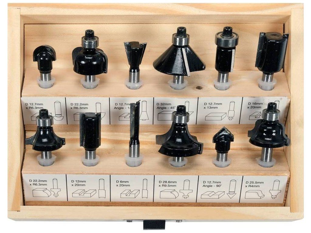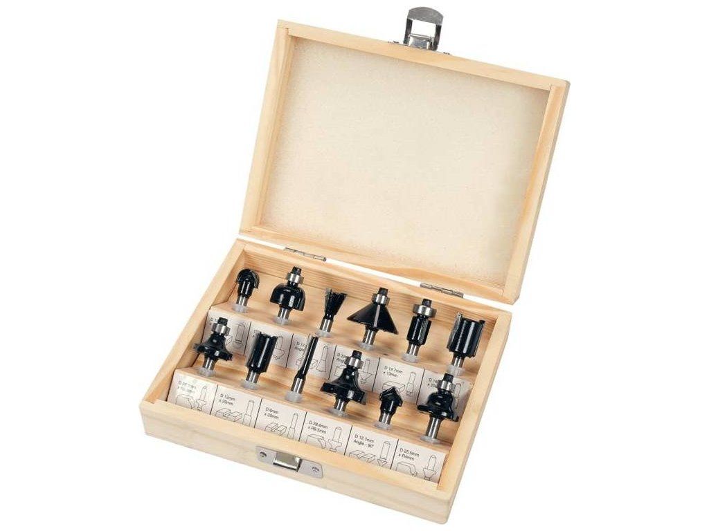 Obsah balení: 3x Rovná řezačka 6, 12, 16 mm Kopírovací fréza s ložiskem 1/2" Drážková fréza 1/2" Děrovací fréza s ložiskem 22 mm Fréza 22 mm Uzavírací fréza 28,6 mm Profilová fréza pro římské oblouky s ložiskem 1" Děrovací fréza typu V: 1/2", úhel - 45° Rybinová řezačka: 1/2", úhel - 14° Řezací frézka s ložiskem: 1 1/4", úhel - 14°| Technická data | |