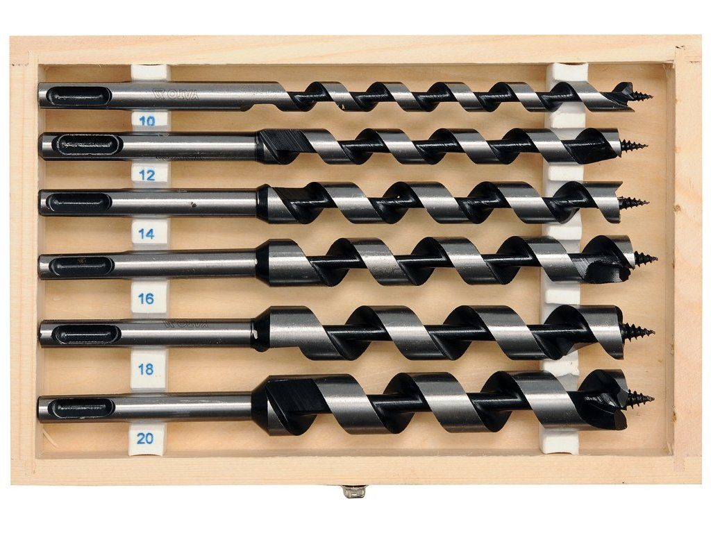 Sada hadovitých vrtáků, pro vrtání hlubokých děr do měkkého i tvrdého dřeva. Vrták má samostředící hrot se závitem, hlavní a pedřezový břit. Plynule odvádí třísku i u mokrého dřeva. Je vyroben z ulíkové oceli a idukčně kalený.