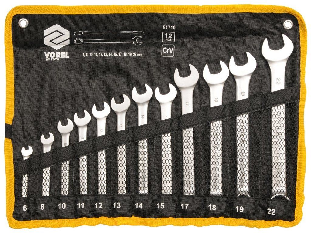 Sada klíčů očkoplochých 12 ks 6 - 22 mm vyrobené z kvalitní CrV oceli, uložené v přehledném odolném pouzdře ze silné syntetické tkaniny.