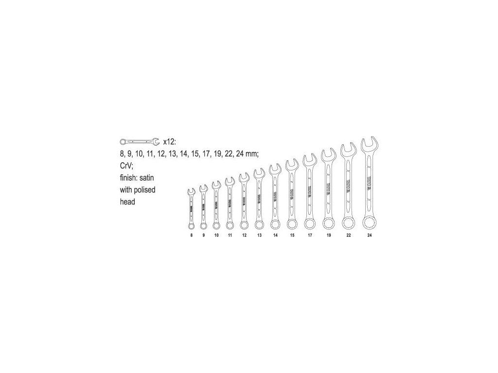 Klíče jsou uložené v pouzdře ze syntetické tkaniny s možností zavěšení, balení obsahuje klíče 8, 9, 10, 11, 12, 13, 14, 15, 17, 19, 22 a 24 mm.