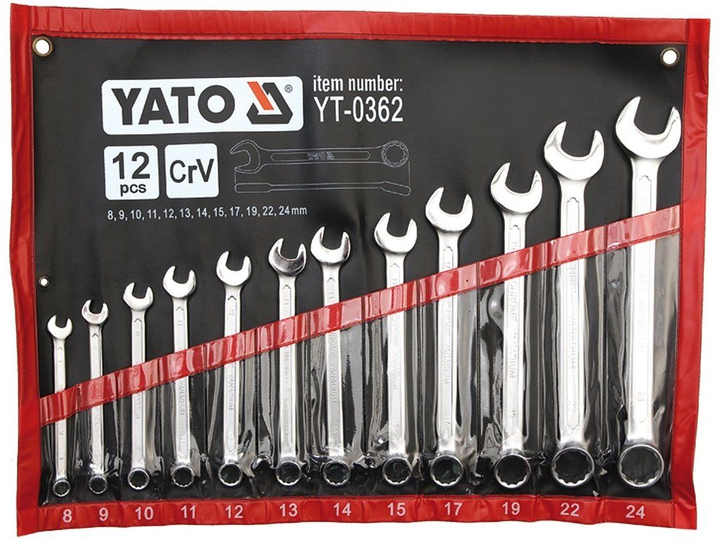 Sada očkoplochých klíčů Yato vyrobených z chromvanadiové slitiny oceli, povrch je částečně satinovaný a leštěný do vysokého lesku. AS-Drive je vylepšený profil u nástrčných a očkových klíčů, v tomto případě očka.
