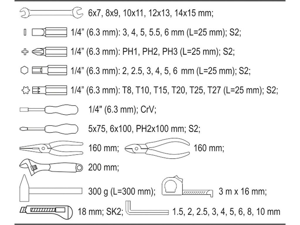 Obsahuje celou řadu nástrojů vhodných jak pro údržbáře, tak i pro běžnou dílnu či domácnost, nebo kamkoliv na cesty.