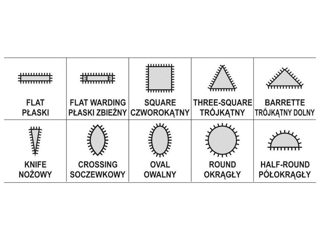 V sadě je plochý, kruhový, trojúhelníkový, nožový, oválný a další tvary pilníků.