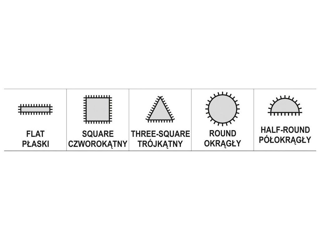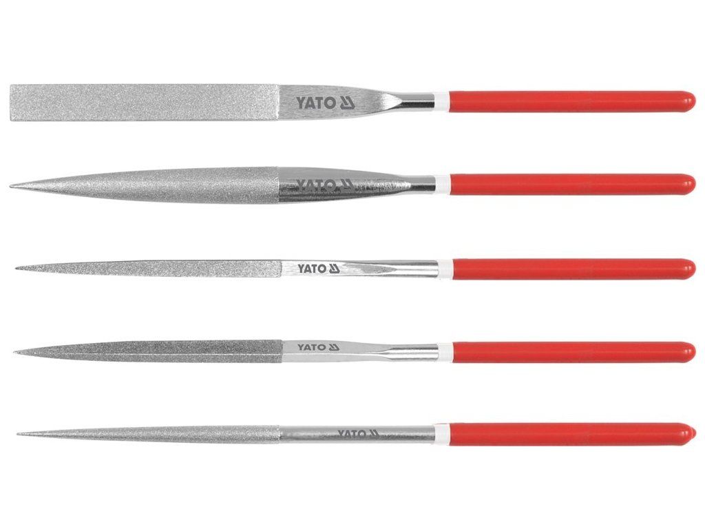 Sada je složena z 5 kusů pilníků různých profilů (plochý, čtvercový, trojúhelníkový/ kulatý a půlkulatý) s rozměry 5x180 mm. Délka brusné části 70 mm.