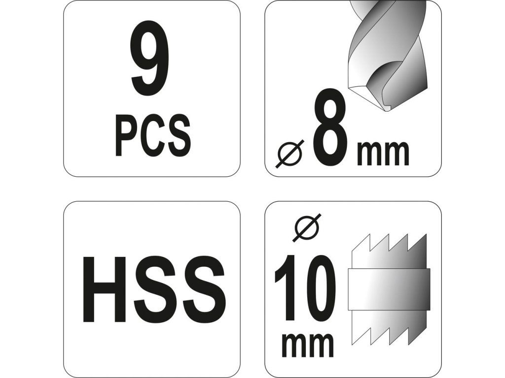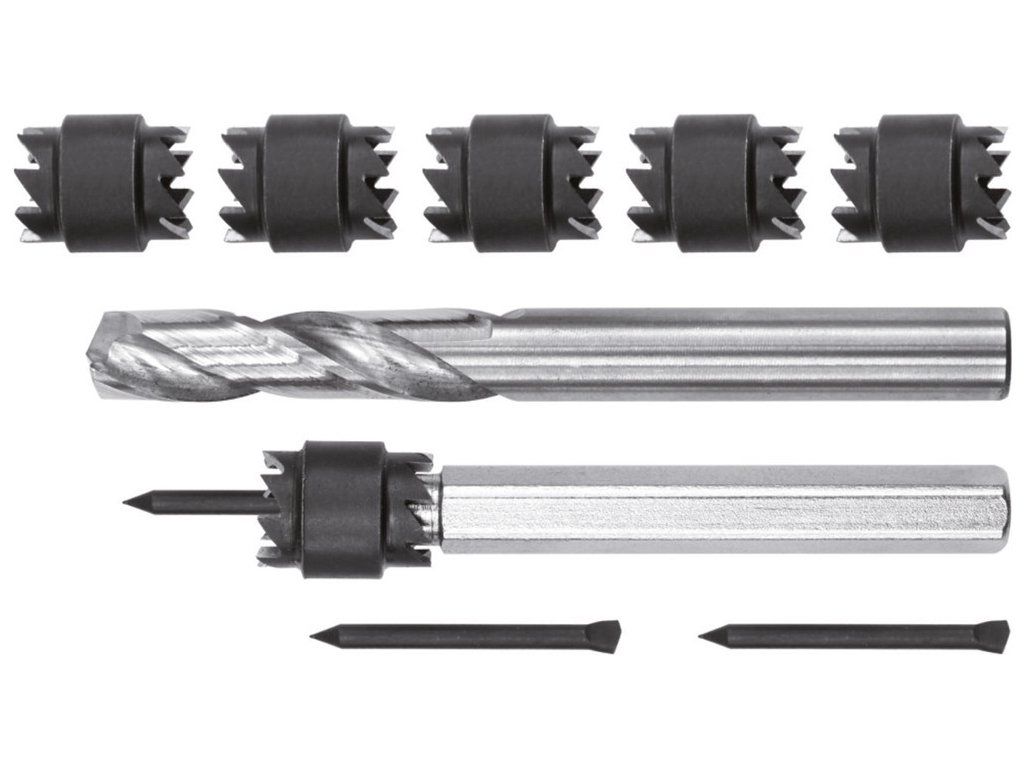 Sada je složena z 6 oboustranných řezačů průměru 10 mm, upínací rukojeti, 3 upevňovacích šroubů a speciálního HSS vrtáku průměru 8 mm.