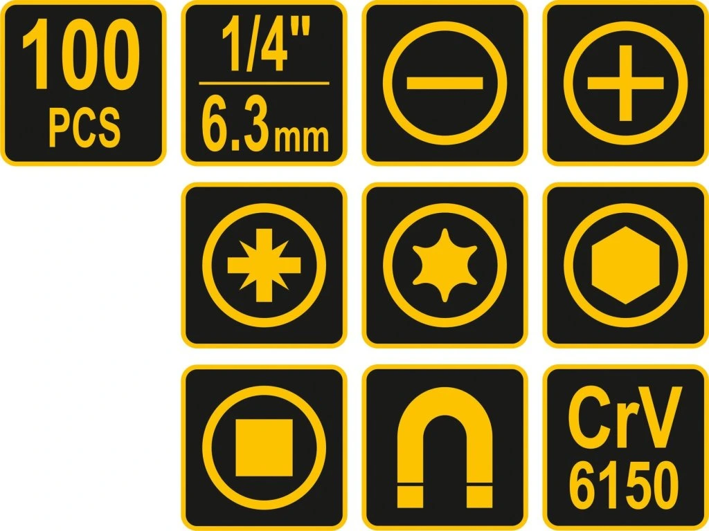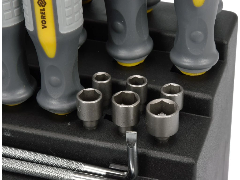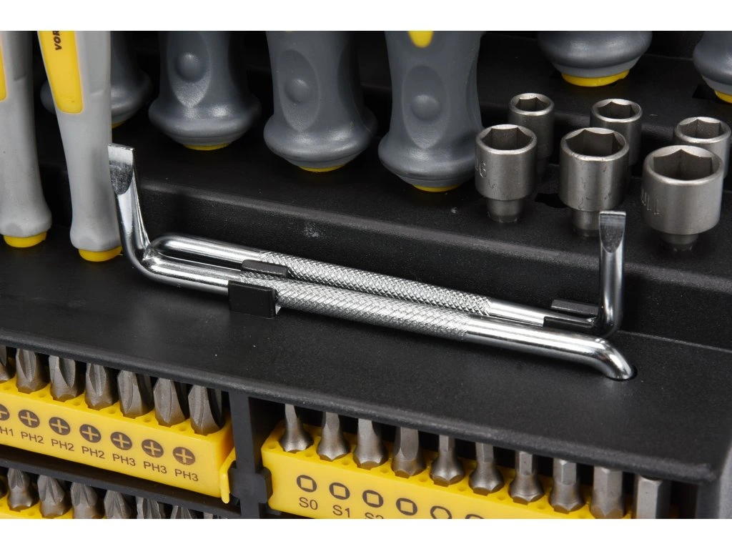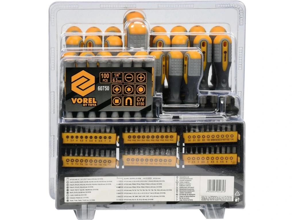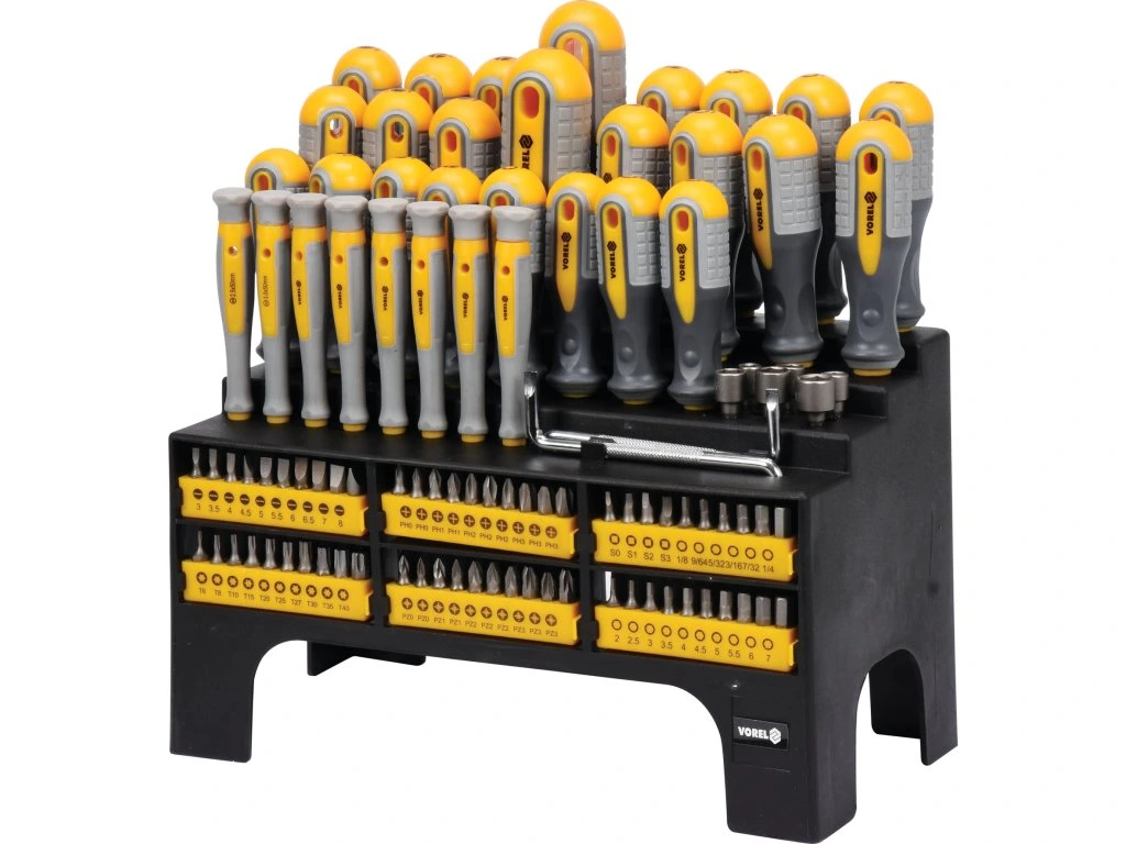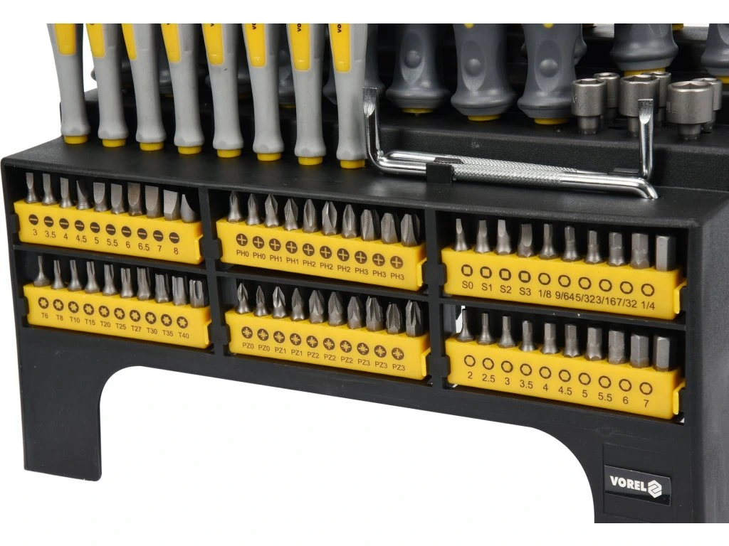 Obsah balení: Šroubovák plochý: 3 x 75; 4 x 100; 5,5 x 75; 5,5 x 100; 6,5 x 150; 8 x 150 mm Šroubovák křížový PH: PH0 x 75; PH1 x 100; PH1 x 150; PH2 x 150 mm Šroubovák křížový PZ: PZ0 x 75; PZ1 x 75; PZ2 x 100 mm Šroubovák Torx: T10 x 75; T20 x 75; T25 x 100; T30 x 100 mm Šroubovák čtvercový: S0 x 75; S1 x 75; S2 x 100 mm Přesný šroubovák plochý: 2,5 x 50; 3 x 50 mm Přesný šroubovák PH: PH00 x 50; PH0 x 50 mm Přesný šroubovák Torx: T6 x 50; T7 x 50; T8 x 50; T10 x 50 mm Oboustranný šroubovák: 5 mm - PH1; 6 mm - PH2 Ráčnový šroubovák Bit plochý: 3; 3,5; 4; 4,5; 5; 5,5; 6; 6,5; 7; 8 mm Bit PH: PH0 x 2; PH1 x 2; PH2 x 3; PH3 x 3 Bit PZ: PZ0 x 2; PZ1 x 2; PZ2 x 3; PZ3 x 3 Bit Torx: T6; T8; T10; T15; T20; T25; T27; T30; T35; T40 Bit imbus: 2; 2,5; 3; 3,5; 4; 4,5; 5; 5,5; 6; 7 mm Bit imbus palcový: 9/64; 1/8; 5/32; 3/16; 7/32; 1/4" Nástavce: 6; 7; 8; 9; 10; 11 mm, 1/4"Doplňkové parametry