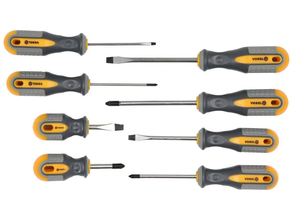 Sada 8ks šroubováků vyrobených z CrV6150 oceli s ergonomicky tvarovanými rukojeťmi z protikluzného PP a TPR.
